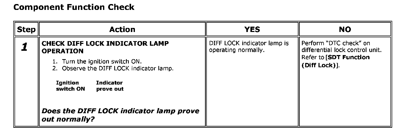 The DIFF LOCK indicator lamp has power available to it any time the ignition switch is in the ON or START position. The differential lock control unit supplies ground to activate the DIFF LOCK indicator lamp. The DIFF LOCK indicator lamp will go through a prove out at initial key ON. The DIFF LOCK will flash while the differential lock system is activating or while waiting for conditions to be met to activate. Once the differential lock has been engaged, the DIFF LOCK indicator lamp will remain ON. For more information about the DIFF LOCK indicator lamp, refer to the Owner's Manual.