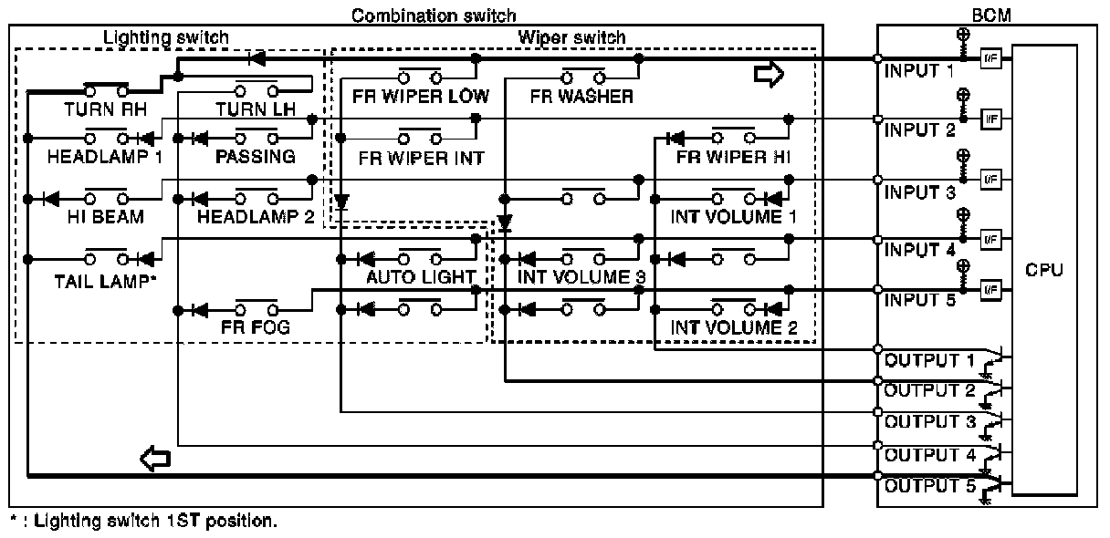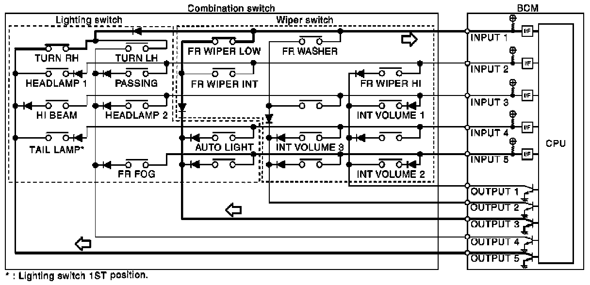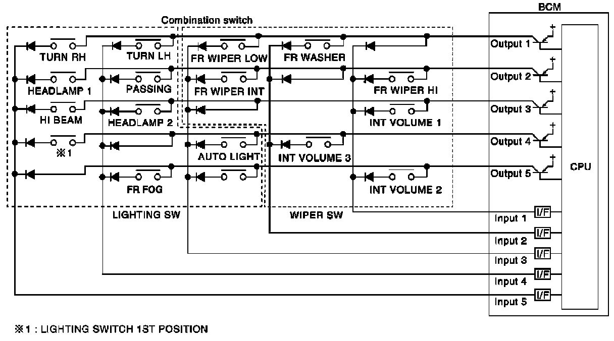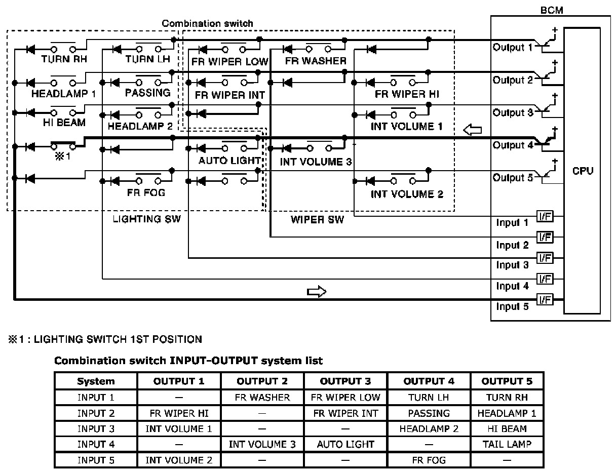 - BCM detects the combination switch status signal "1CE" when the signals of OUTPUT 3 and OUTPUT 5 are input to INPUT 1.