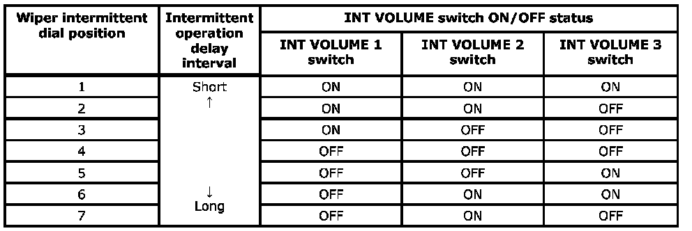 BCM judges the wiper intermittent dial 1 - 7 by the status of INT VOLUME 1, 2 and 3 switches.