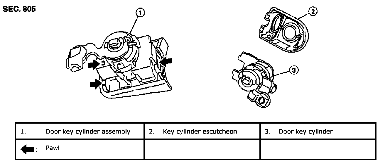 Remove the key cylinder escutcheon pawl and remove the door key cylinder.