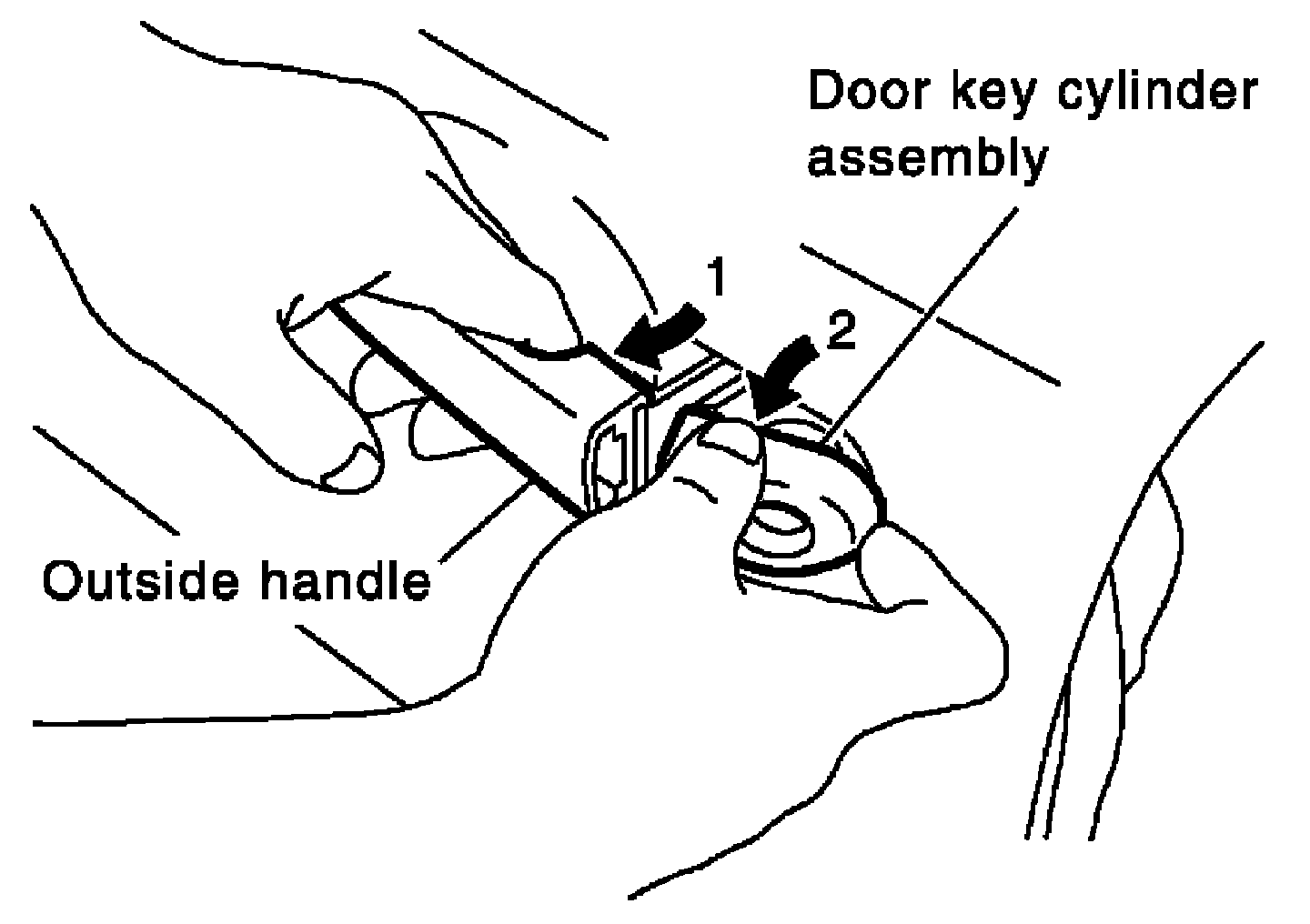 4. While pulling the outside handle (1), remove door key cylinder assembly or escutcheon (2).