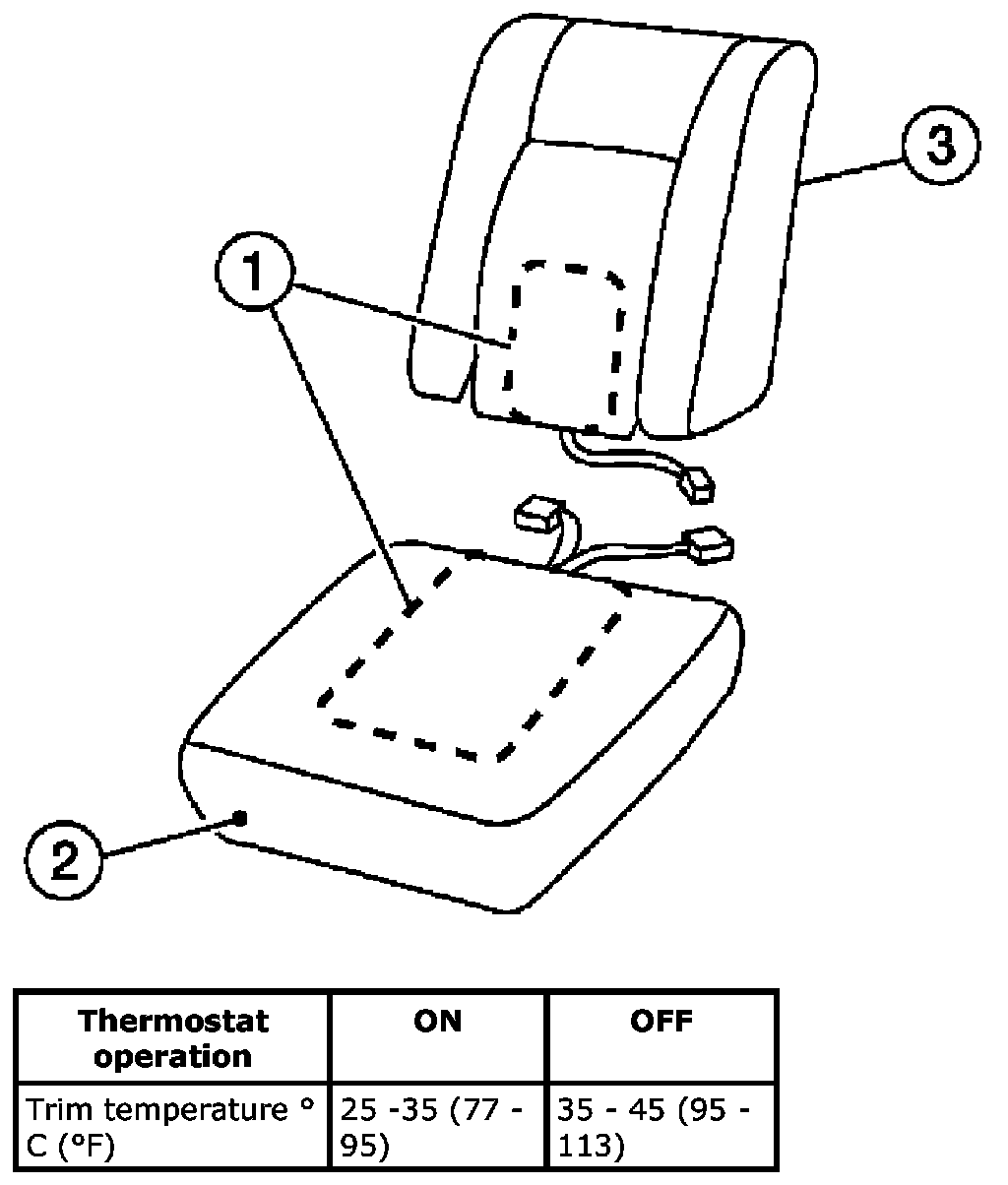 - To replace heating unit for vehicles without side air bags, seat trim and pad should be separated. For vehicles equipped with side air bags, seat trim and pad should be separated for the front seat cushion LH. For seatback and front seat cushion RH, complete cushion (2) or seatback assembly (3) must be replaced.