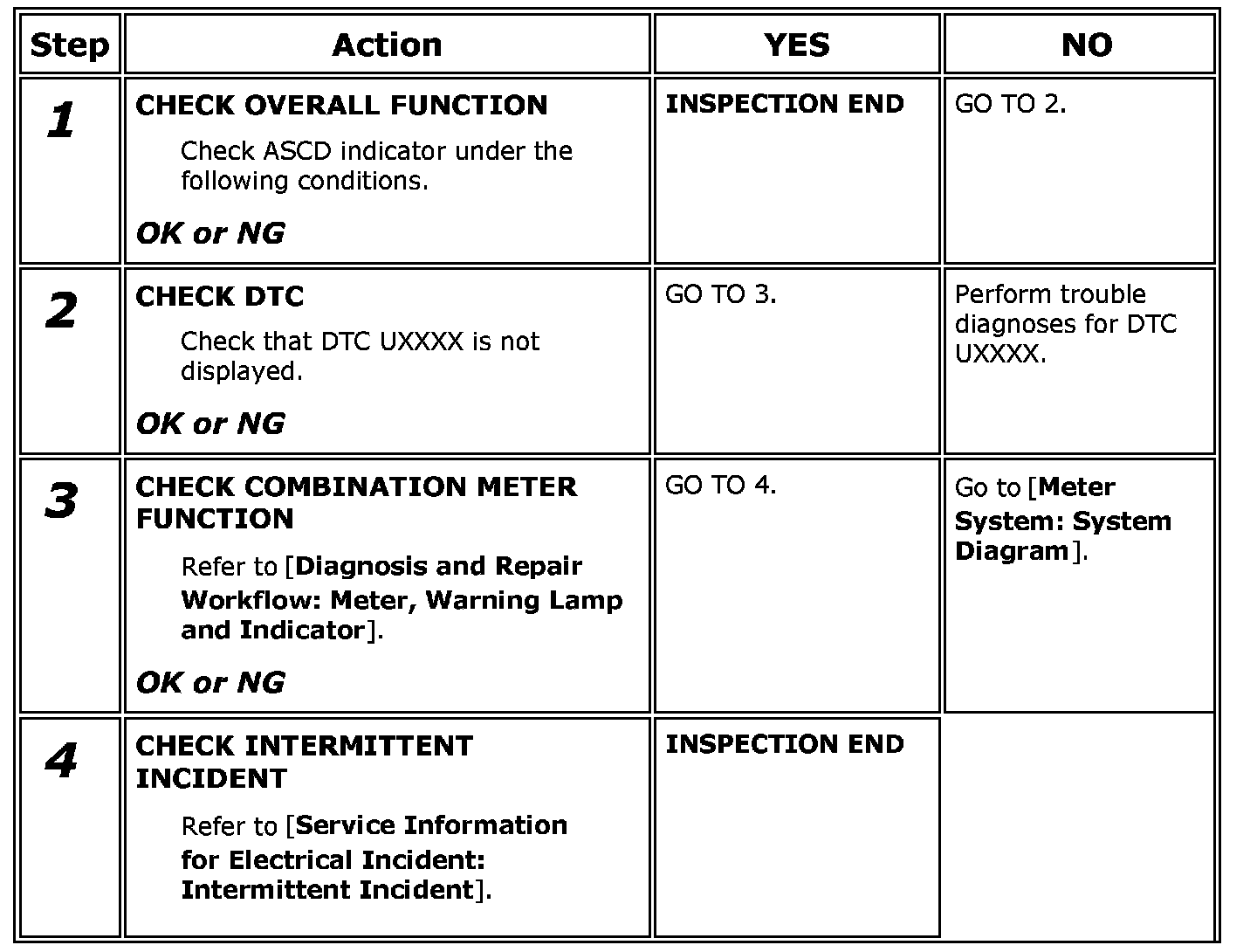 ASCD indicator lamp illuminates to indicate ASCD operation status. Lamp has two indicators, CRUISE and SET, and is integrated in combination meter. CRUISE indicator illuminates when MAIN switch on ASCD steering switch is turned ON to indicated that ASCD system is ready for operation. SET indicator illuminates when the following conditions are met.