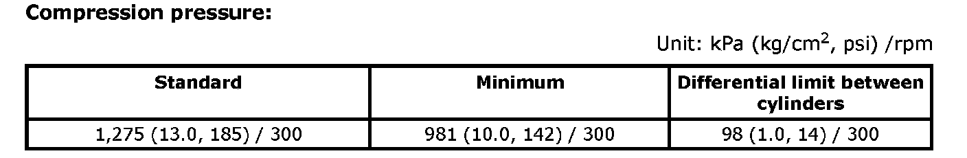 ^ If the compression pressure is below the minimum value, check the valve clearances and parts associated with the combustion chamber (valve, valve seat, piston, piston ring, cylinder bore, cylinder head, cylinder head gasket). After the checking, measure the compression pressure again.