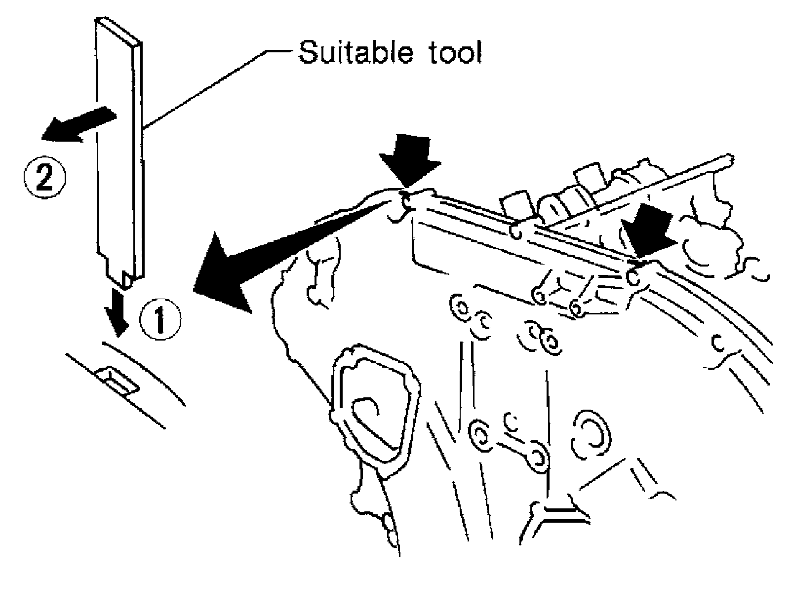 c) Pry off case by moving tool as shown (2).