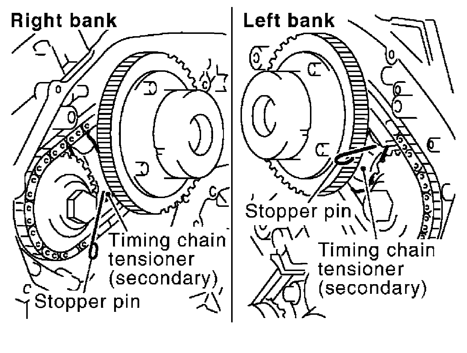 a) Attach suitable stopper pin to the right and left timing chain tensioners (secondary).