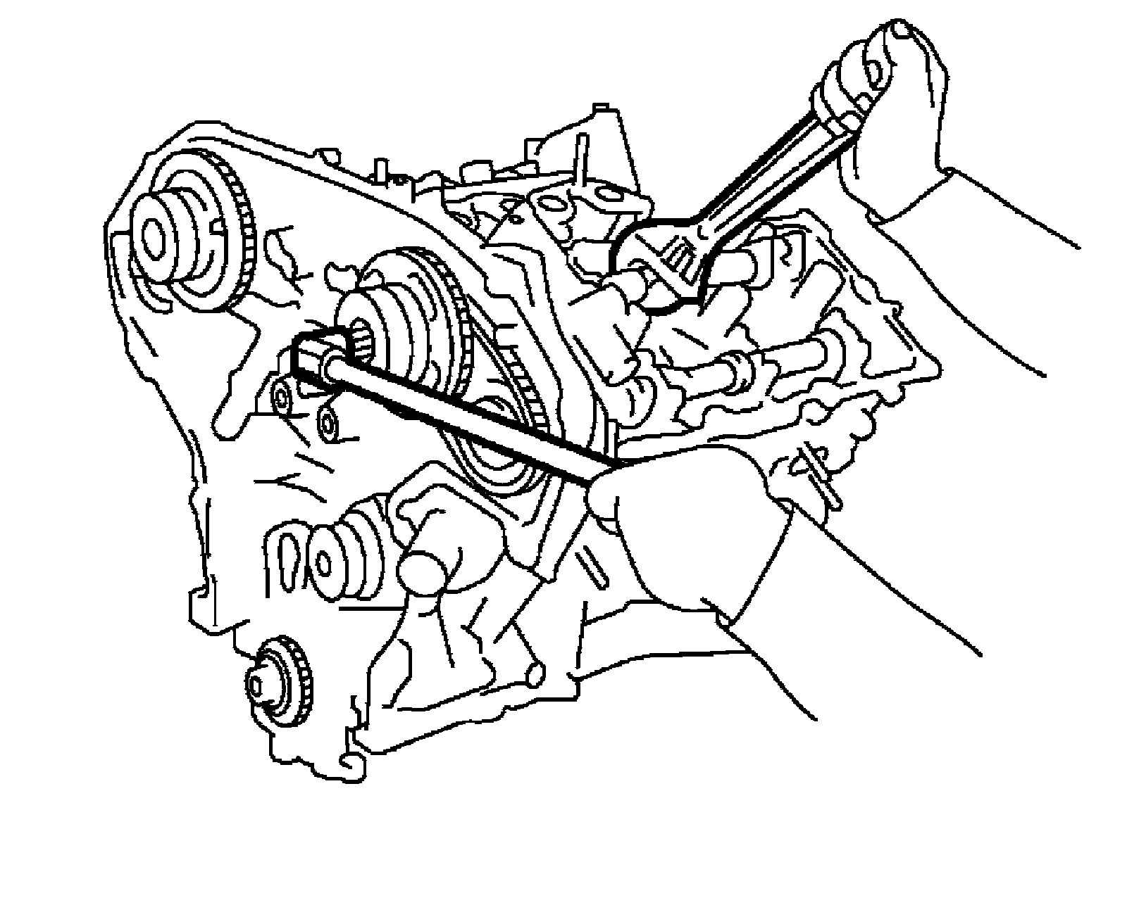 11) Remove water bypass hose, water hose clamp and idler pulley bracket from front timing chain case.