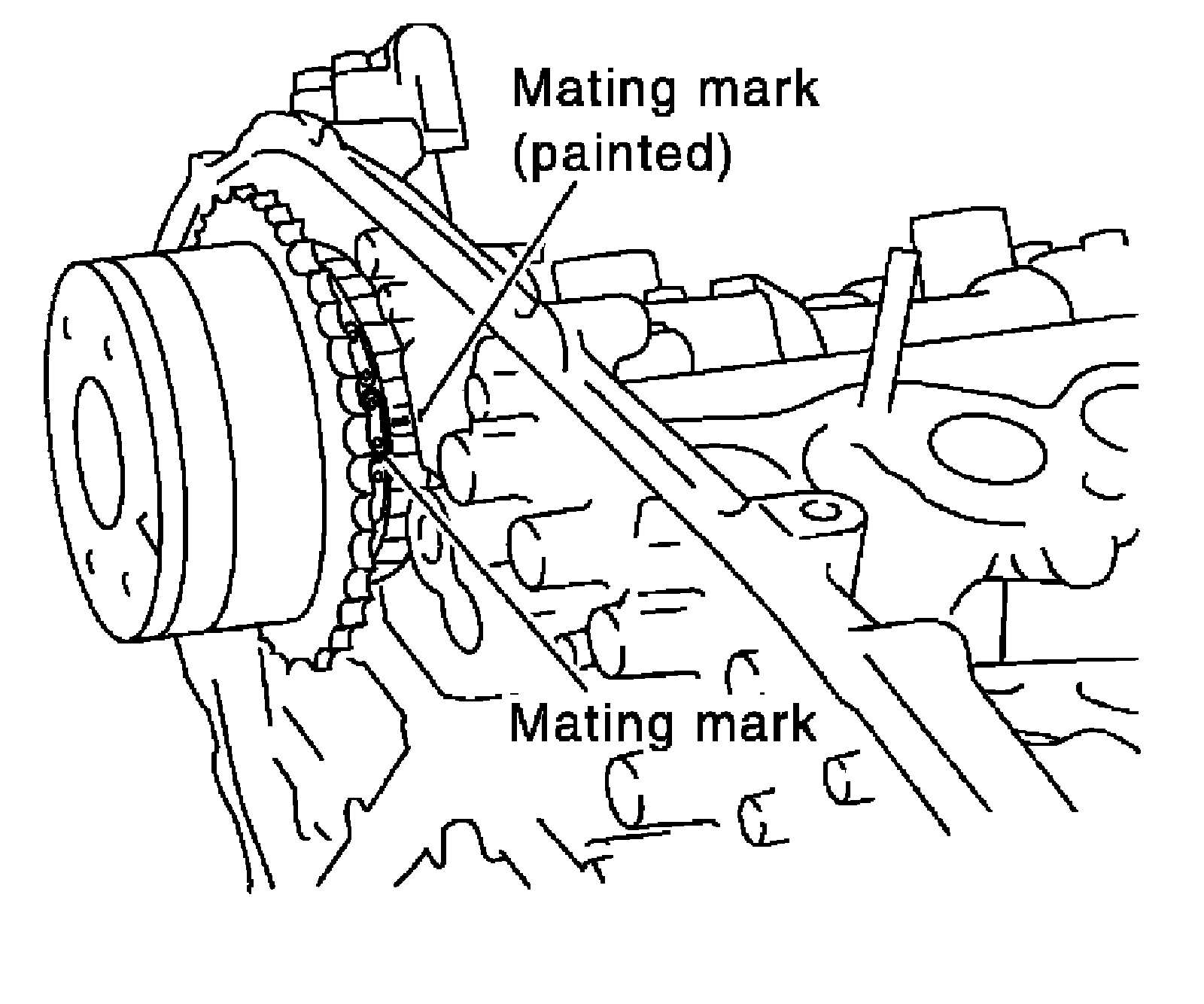 The figure above shows the relationship between the mating mark on each timing chain and that on the corresponding sprocket, with the components installed.