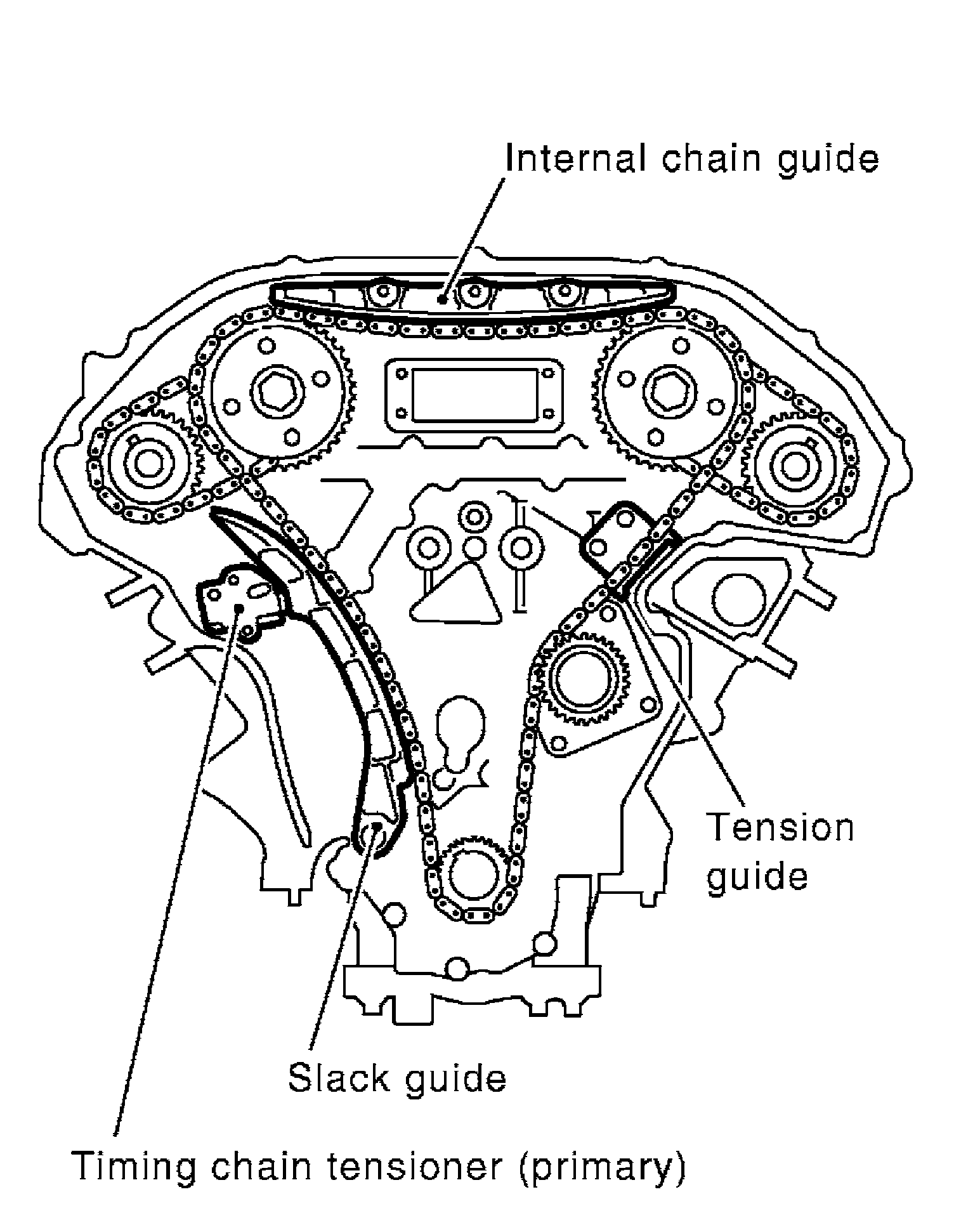 8) Install internal chain guide, slack guide and timing chain tensioner (primary).