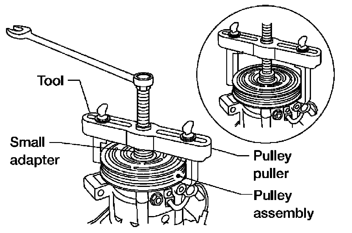 5. Remove the pulley using Tool with a small adapter. Position the small adapter on the end of the drive shaft and the center of the puller on the small adapter.