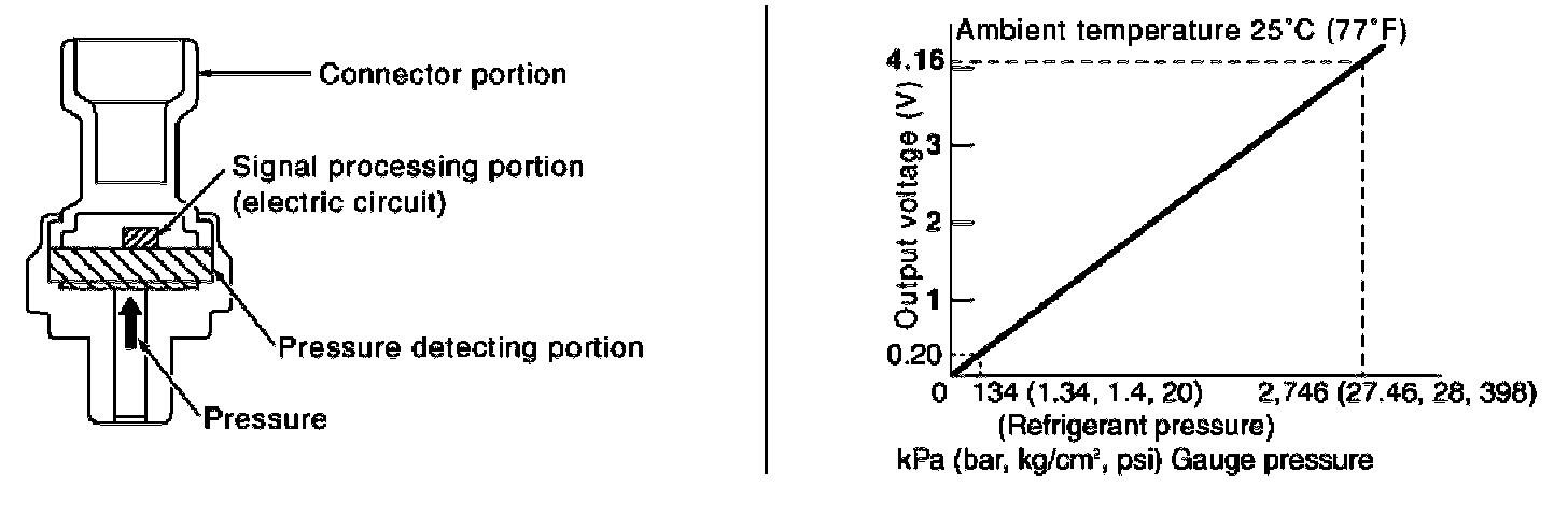The refrigerant pressure sensor is installed at the condenser of the air conditioner system. The sensor uses an electrostatic volume pressure transducer to convert refrigerant pressure to voltage. The voltage signal is sent to ECM, and ECM controls cooling fan system.