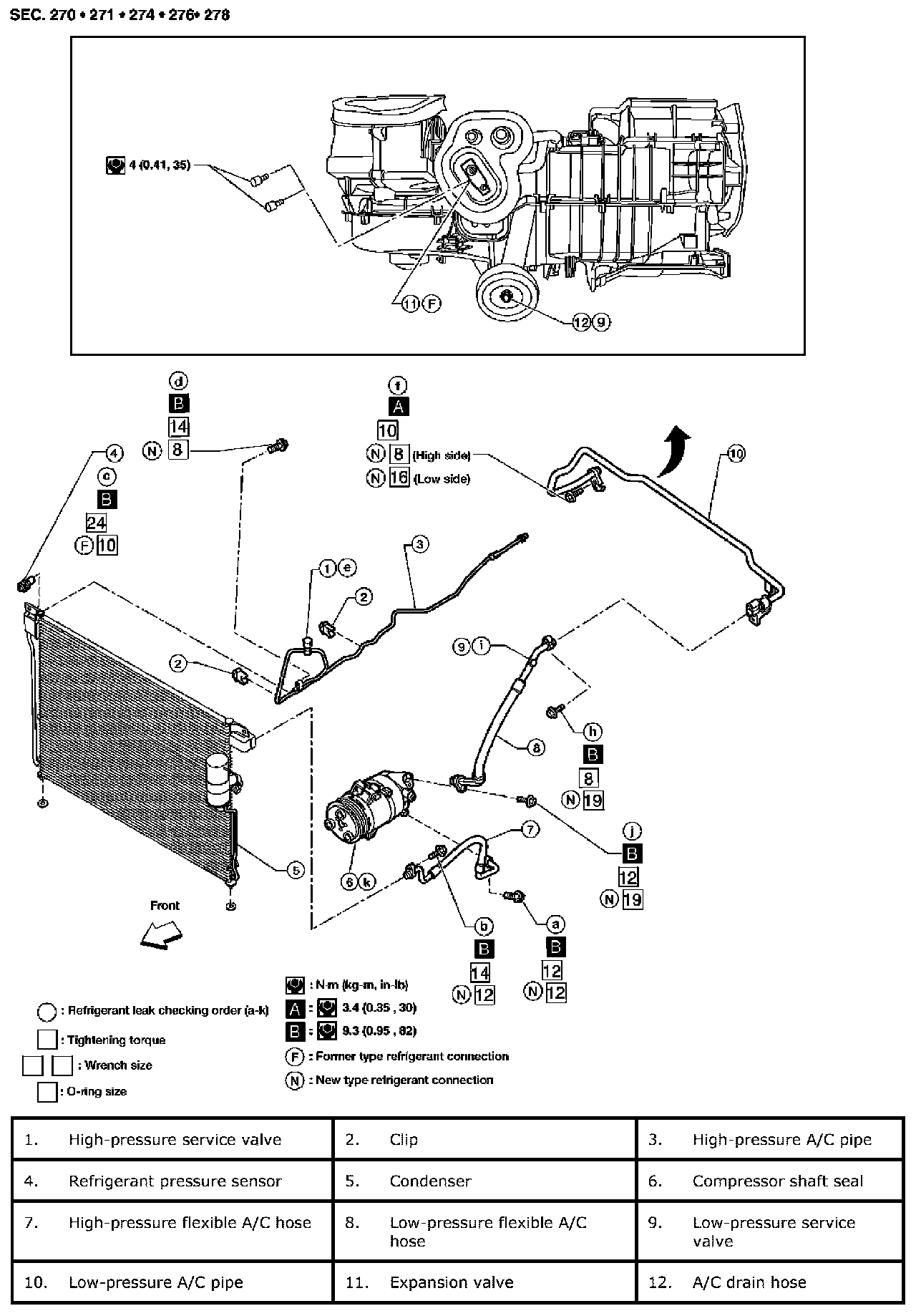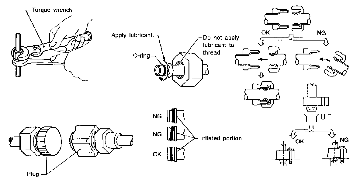 - After connecting line, conduct leak test and make sure that there is no leakage from connections. When the refrigerant leaking point is found, disconnect that line and replace the O-ring. Then tighten connections of seal seat to the specified torque.