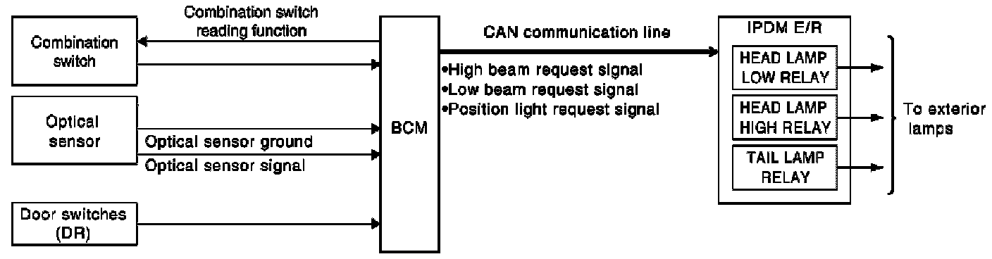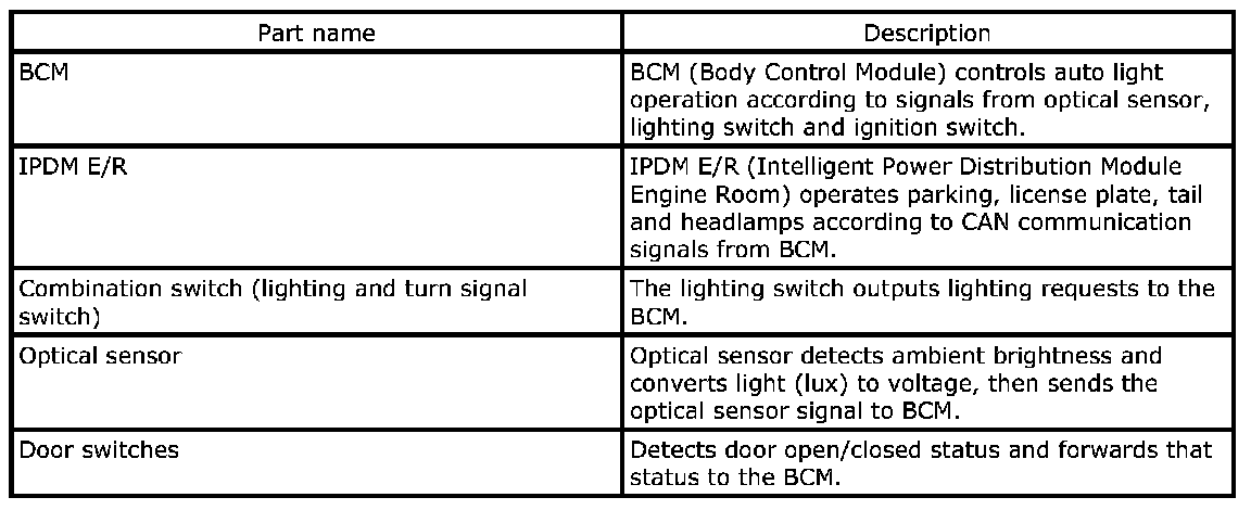 The auto light system operates the low beam and high beam headlamps, parking lamps, tail lamps and license plate lamps. The BCM monitors the lighting switch (combination switch) position as a part of the BCM combination switch reading function. When the lighting switch is in the AUTO position, the BCM automatically turns the lamps ON/OFF according to ambient light brightness. When the key is turned OFF and all doors are closed, the auto light system keeps the headlamps ON for 45 seconds.