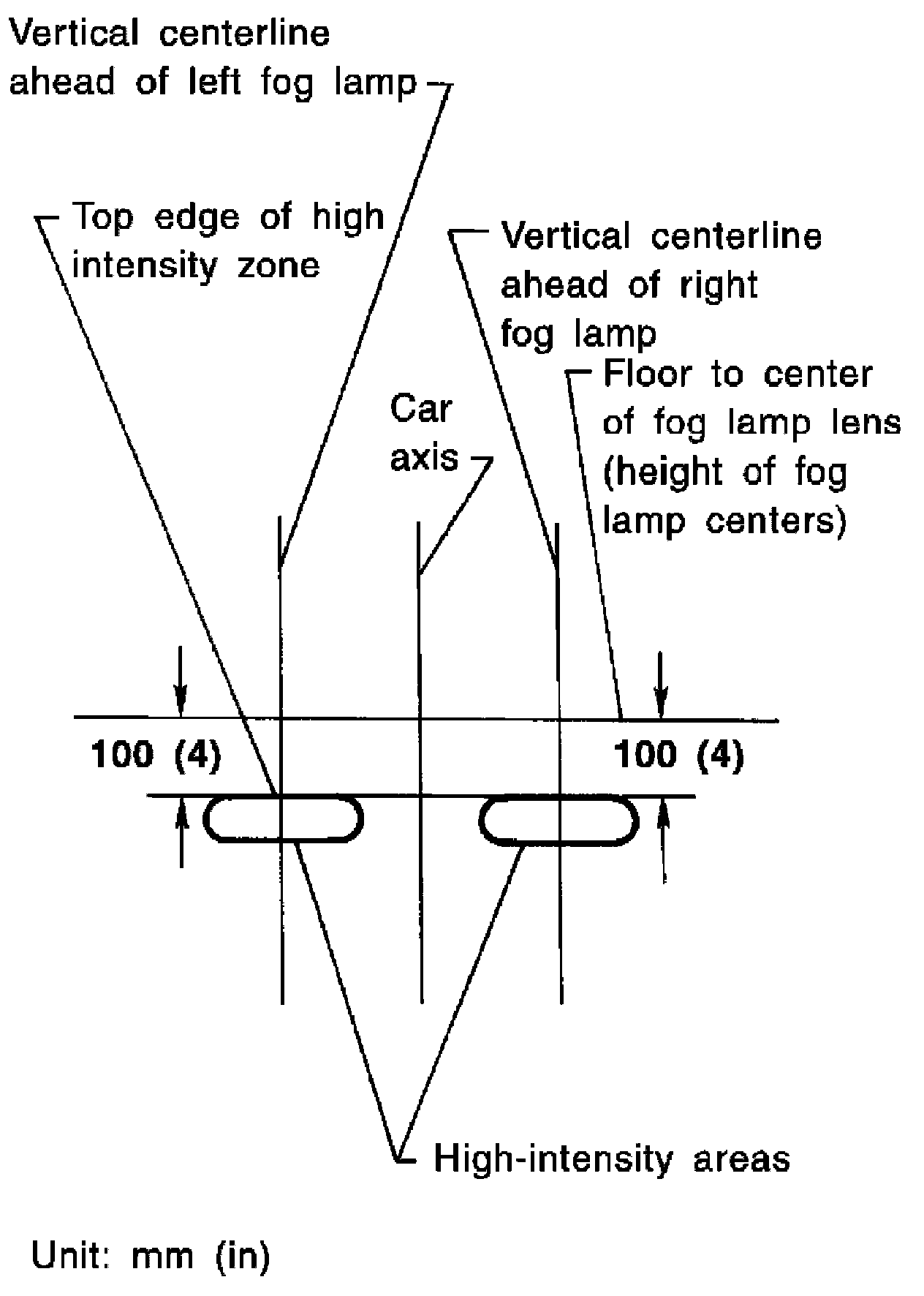 4. Adjust front fog lamps using adjustment screw so that the top edge of the high intensity zone is 100 mm (4 in) below the height of the fog lamp centers as shown.
