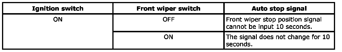 When a front wiper auto stop signal is in the conditions listed below, IPDM E/R stops power supply to wiper after repeating a front wiper 10 second activation and 20 second stop five times.