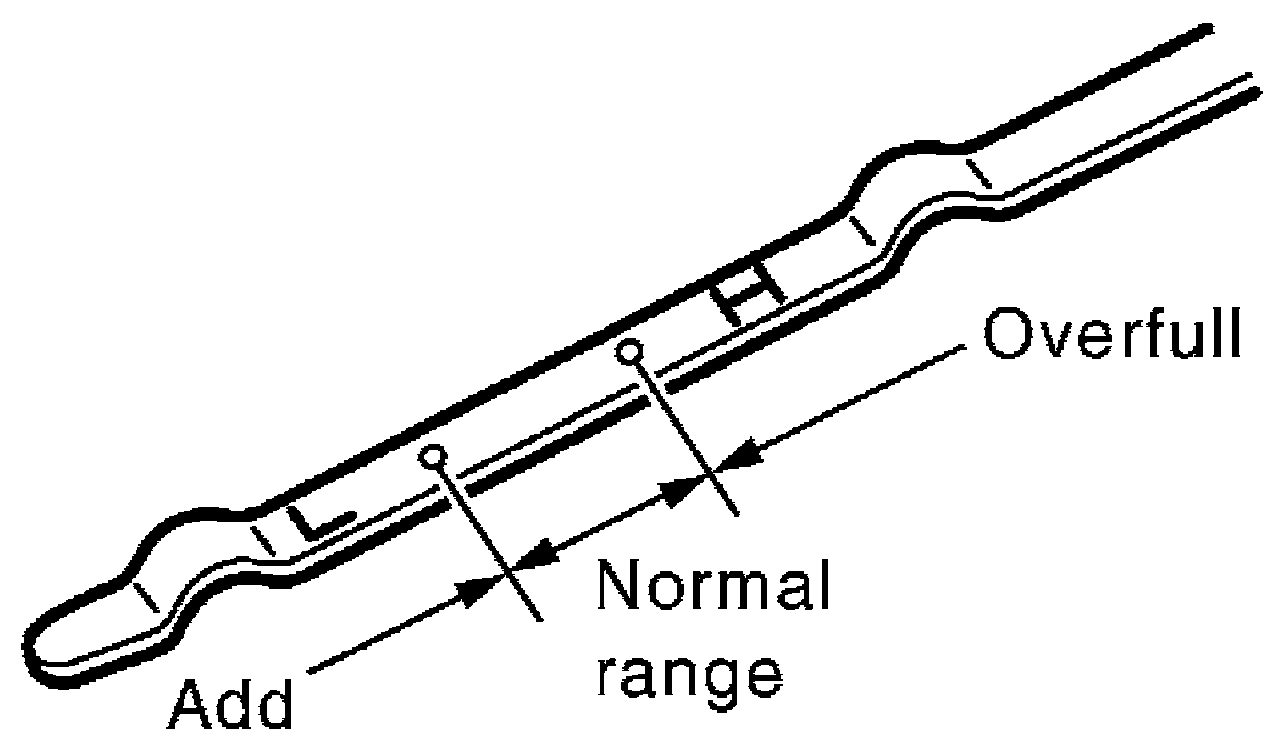 - Check that the oil level is within the low (L) and high (H) range as indicated on the dipstick.