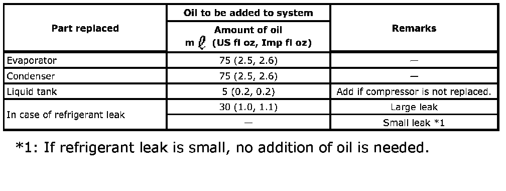 After replacing any of the following major components, add the correct amount of oil to the system.