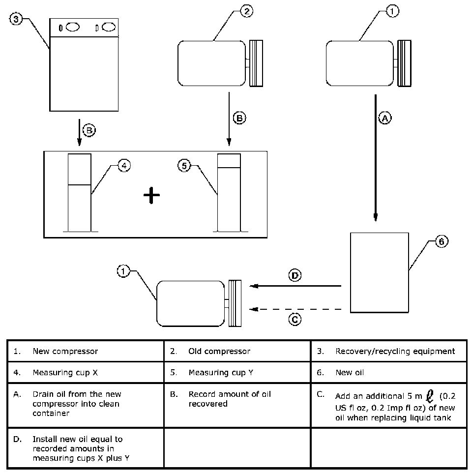 5. Drain the oil from the "old" (removed) compressor into a graduated container and recover the amount of oil drained.