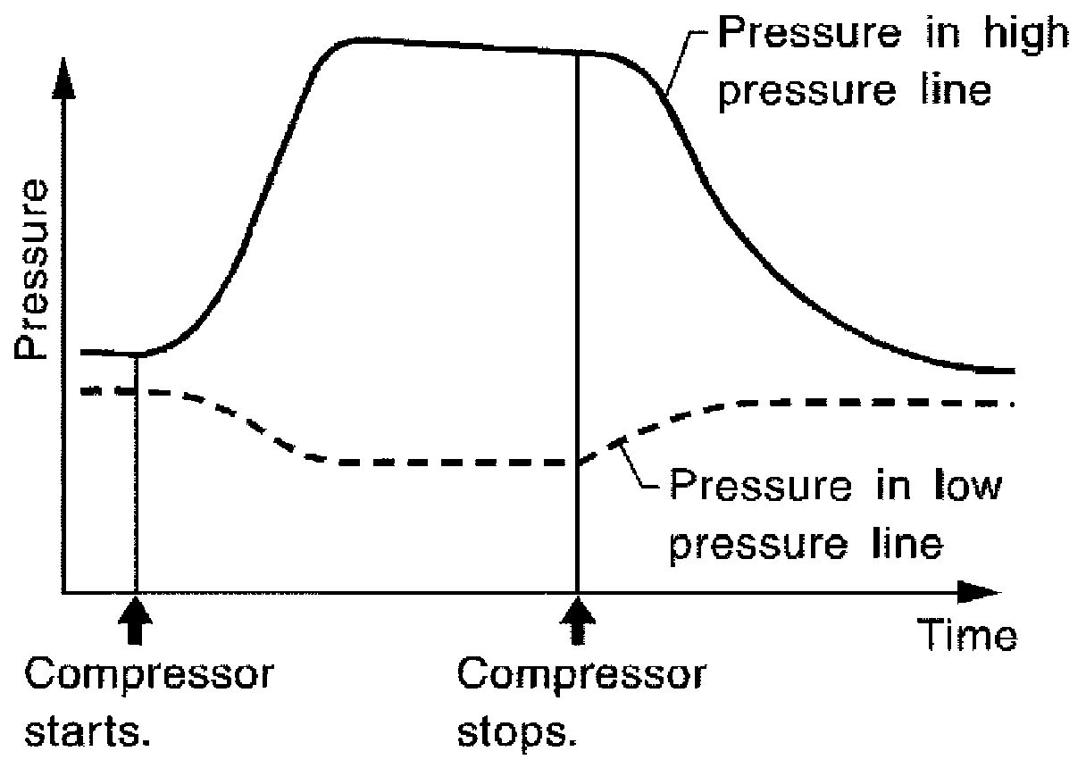 Refrigerant leaks should be checked immediately after turning the engine OFF. Begin with the leak detector at the compressor. The pressure on the high pressure side will gradually drop after the refrigerant circulation stops and pressure on the low pressure side will gradually rise, as shown in the graph. Some leaks are more easily detected when the pressure is high.