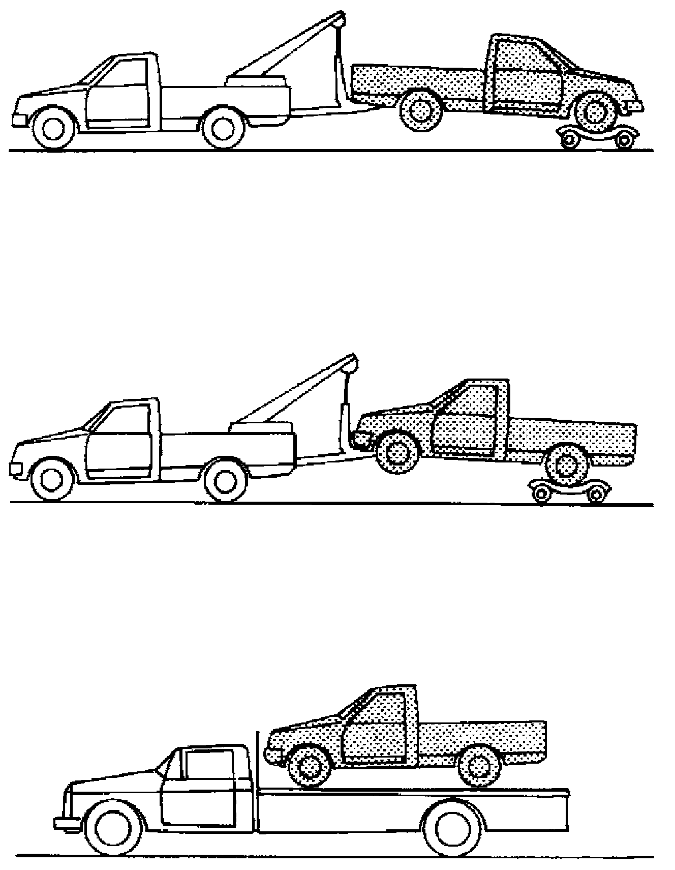 - When towing, make sure that the transmission, steering system and powertrain are in good order. If any unit is damaged, dollies must be used.