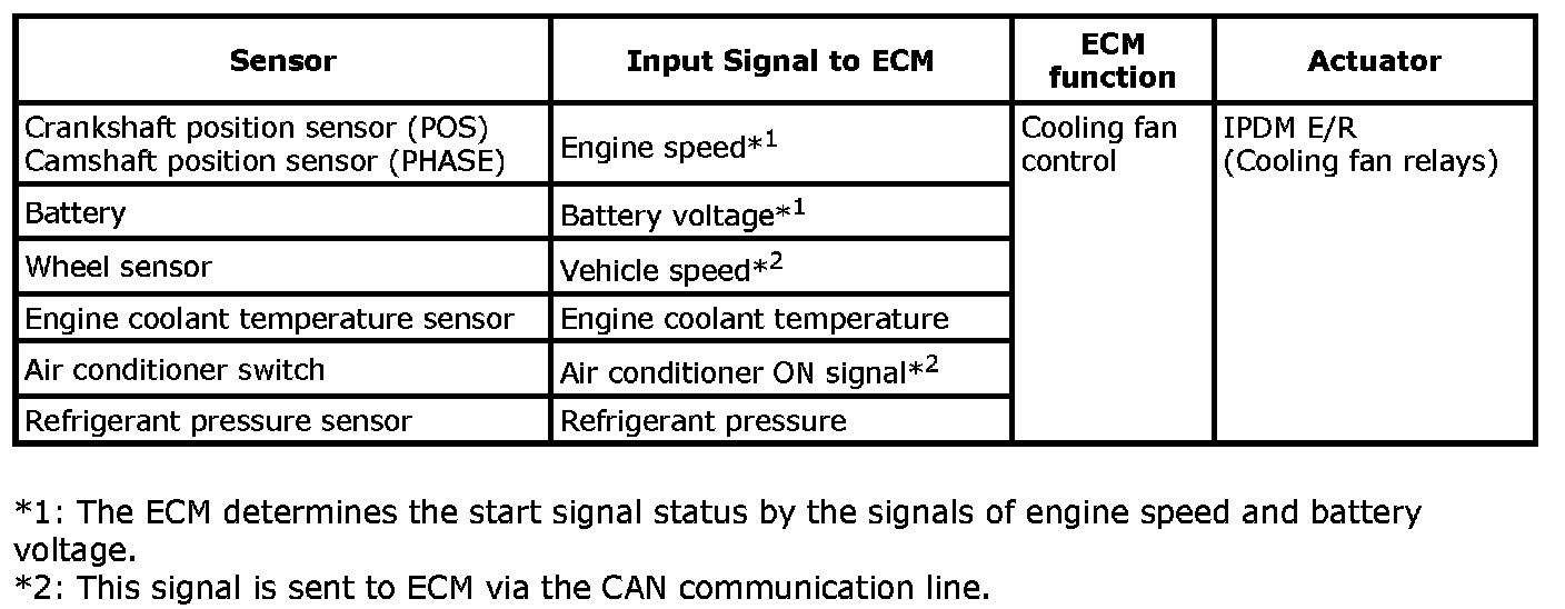 The ECM controls cooling fan relays in the IPDM E/R via the CAN communication line.
