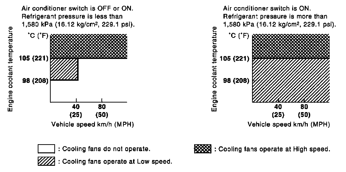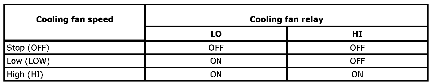 The ECM controls the cooling fan corresponding to the vehicle speed, engine coolant temperature, refrigerant pressure, and air conditioner ON signal. The control system has 3-step control [HIGH/LOW/OFF].