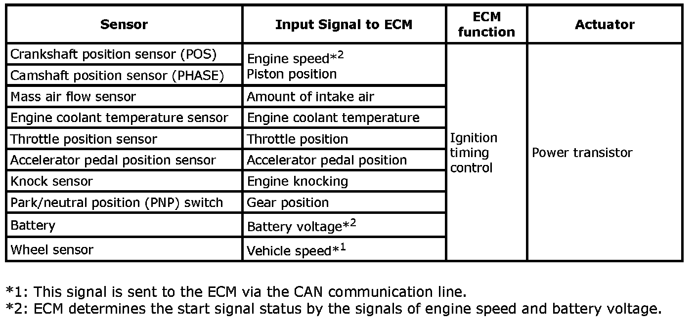 The ECM receives information such as the injection pulse width and camshaft position sensor (PHASE) signal. Computing this information, ignition signals are transmitted to the power transistor.