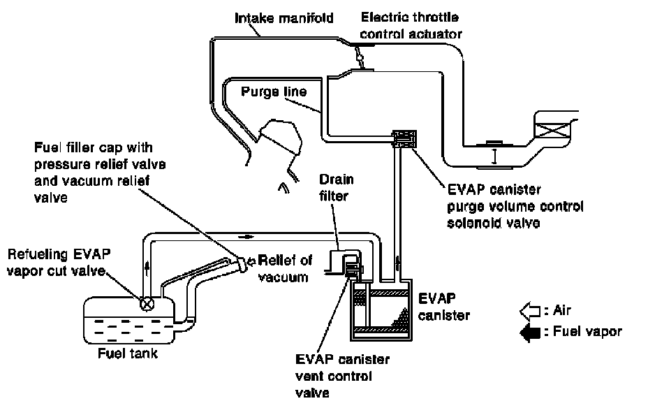 The vapor in the EVAP canister is purged by the air through the purge line to the intake manifold when the engine is operating. EVAP canister purge volume control solenoid valve is controlled by ECM. When the engine operates, the flow rate of vapor controlled by EVAP canister purge volume control solenoid valve is proportionally regulated as the air flow increases.