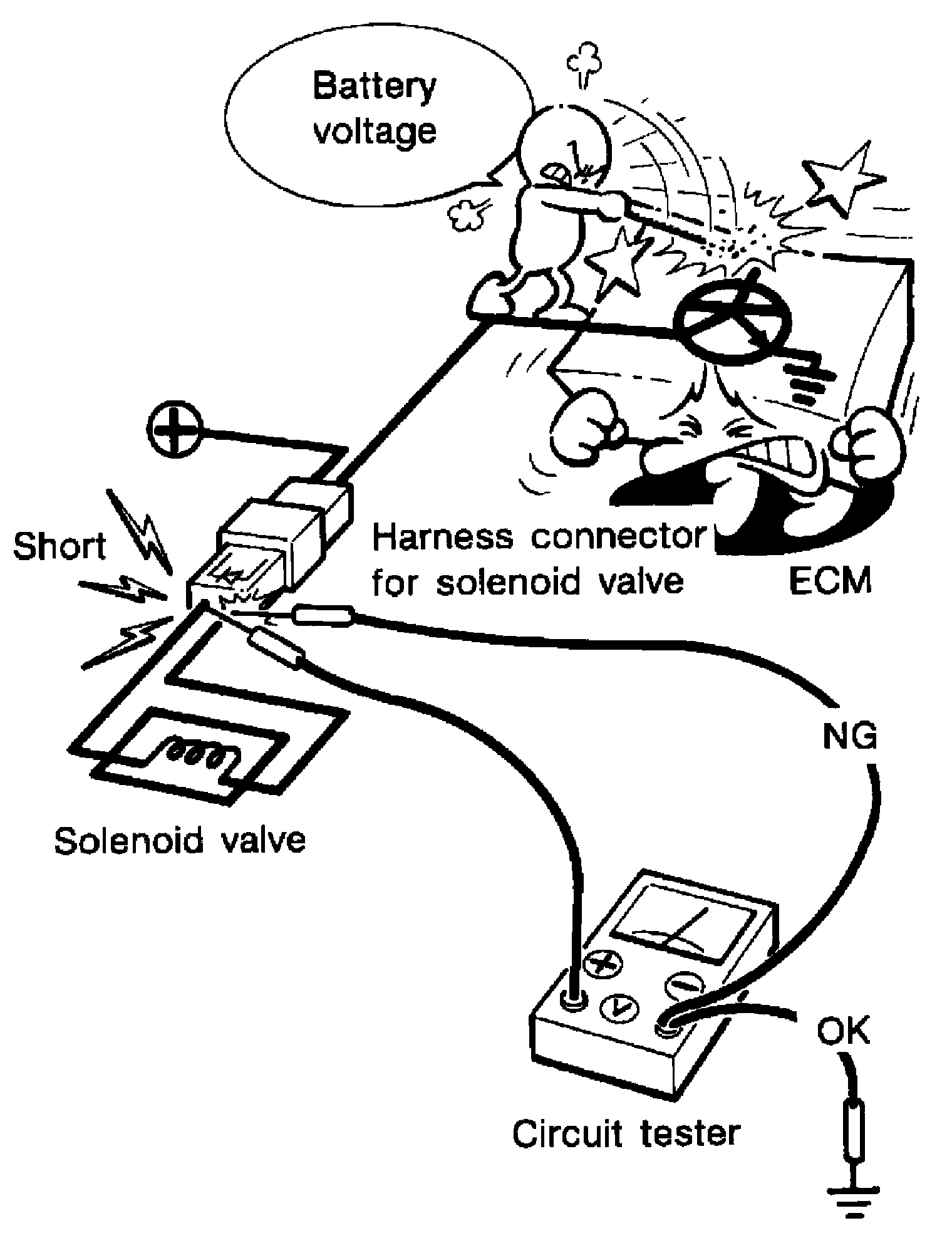 Accidental contact of probes will cause a short circuit and damage the ECM power transistor.