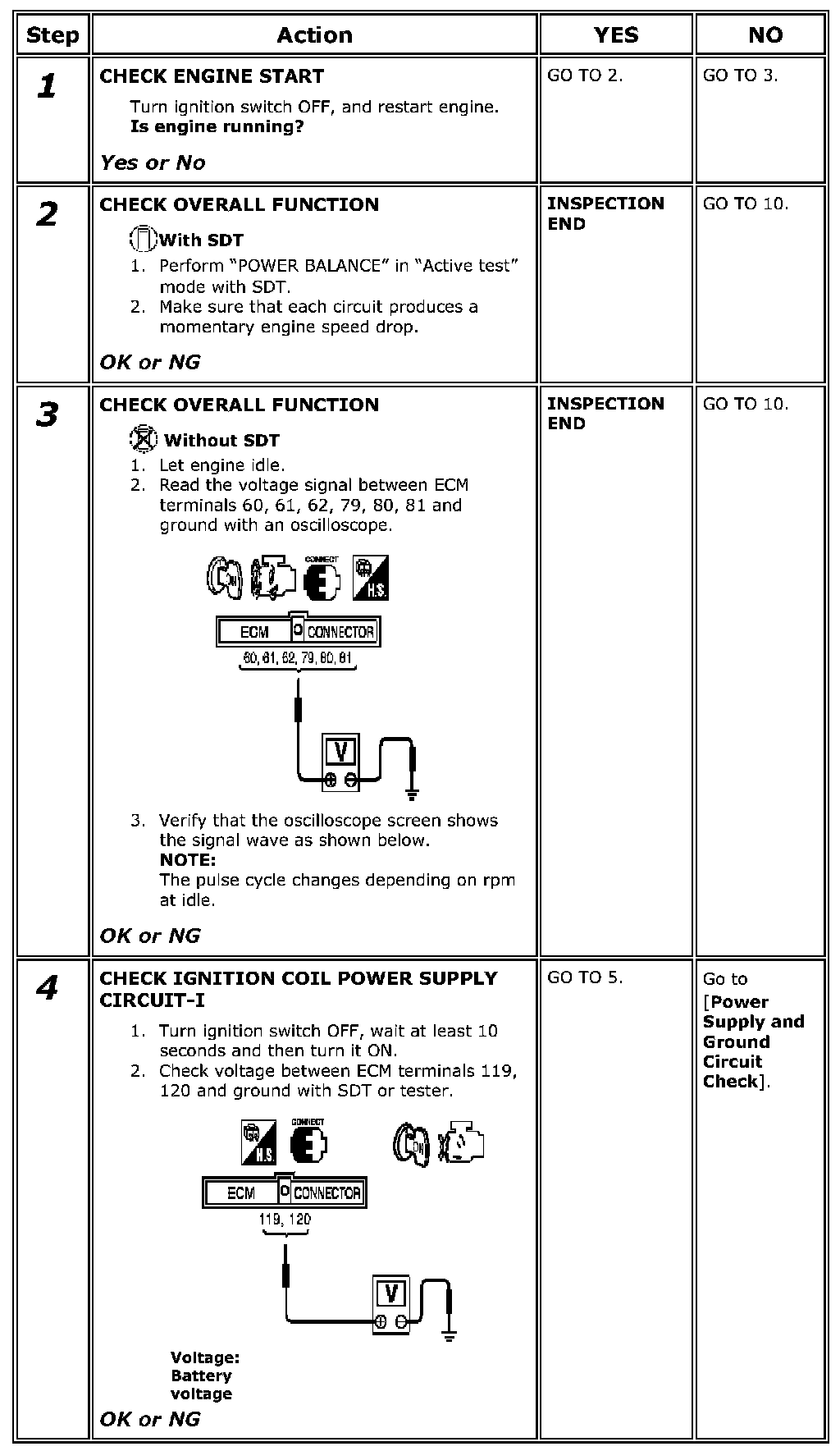 The ignition signal from the ECM is sent to and amplified by the power transistor. The power transistor turns ON and OFF the ignition coil primary circuit. This ON/OFF operation induces the proper high voltage in the coil secondary circuit.