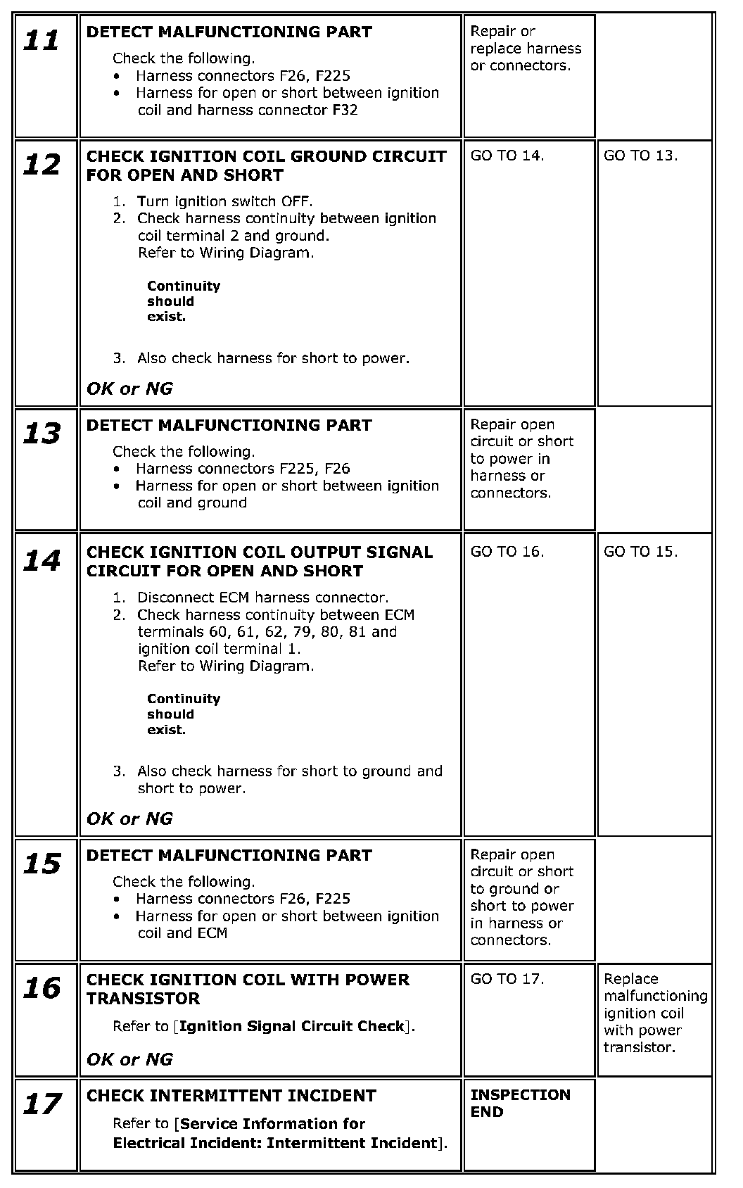 16. Crank engine for about three seconds, and check whether spark is generated between the spark plug and the grounded part.