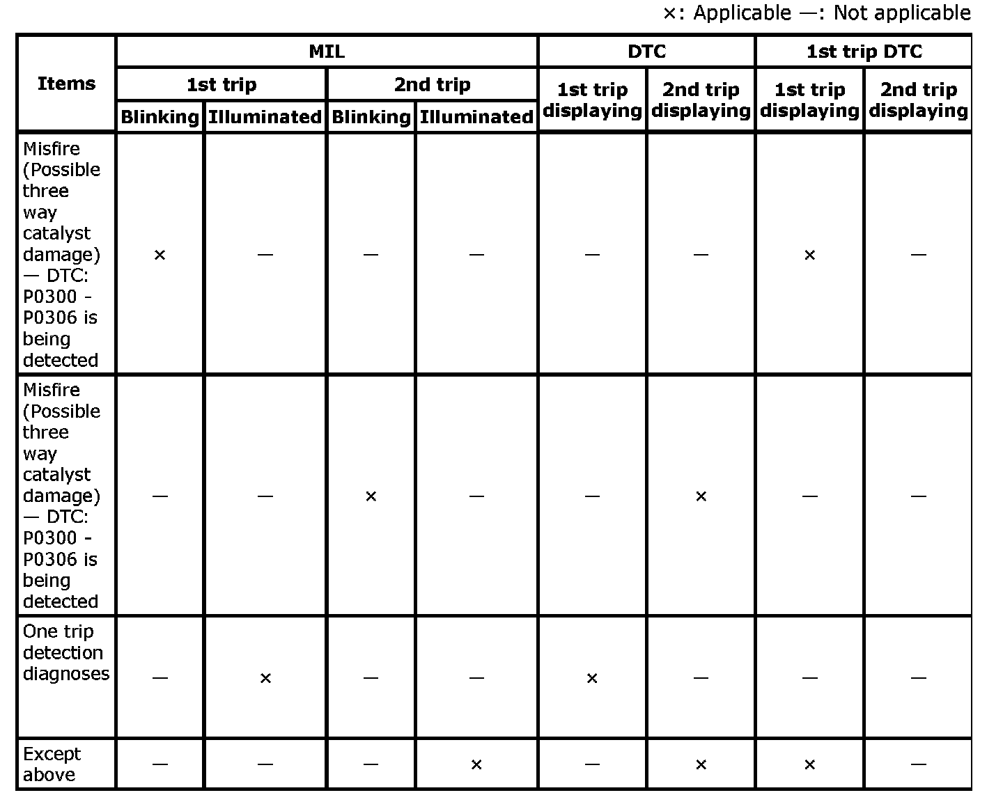 If the same malfunction is detected again during the next drive, the DTC and Freeze Frame data are saved in the ECM memory, and the MIL illuminates. The MIL illuminates at the same time when the DTC is saved. [2nd trip] The "trip" in the "Two Trip Detection Logic" means a driving mode in which self-diagnosis is performed during vehicle operation. Specific on board diagnostic items will cause the ECM to illuminate or blink the MIL, and save DTC and Freeze Frame data, even in the 1st trip, as shown below.