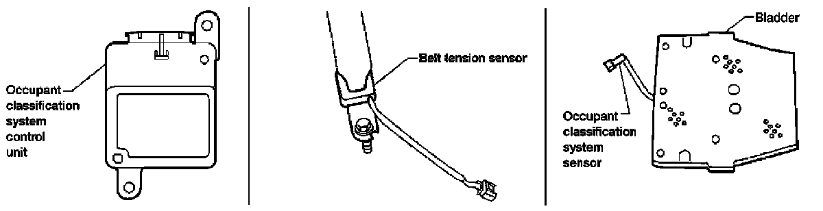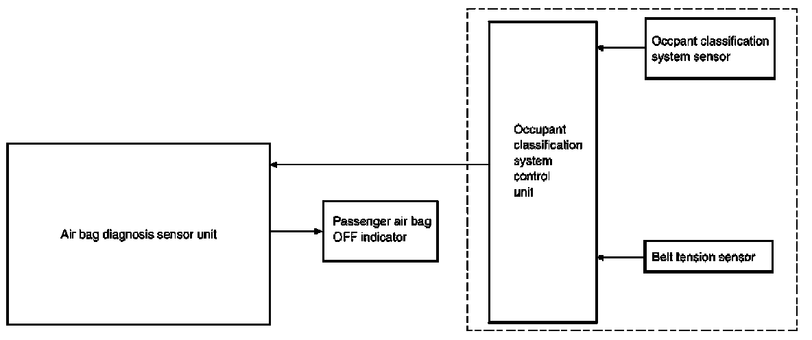 The occupant classification system (OCS) identifies different size occupants, out of position occupants, and detects if child seat is present in the front passenger seat. The OCS receives inputs from the occupant classification sensor (located inside the passenger seat cushion assembly) and belt tension sensor (part of the passenger front seat belt assembly and located at the belt anchor location). Depending on classification of the passenger, the OCS sends a signal to the air bag diagnosis sensor unit. The air bag diagnosis sensor unit uses this signal and the seat belt buckle switch RH signal to determine deployment or non deployment of the passenger front air bag in the event of a collision. Depending on the signals received, the air bag diagnosis sensor unit can disable the passenger front air bag completely.