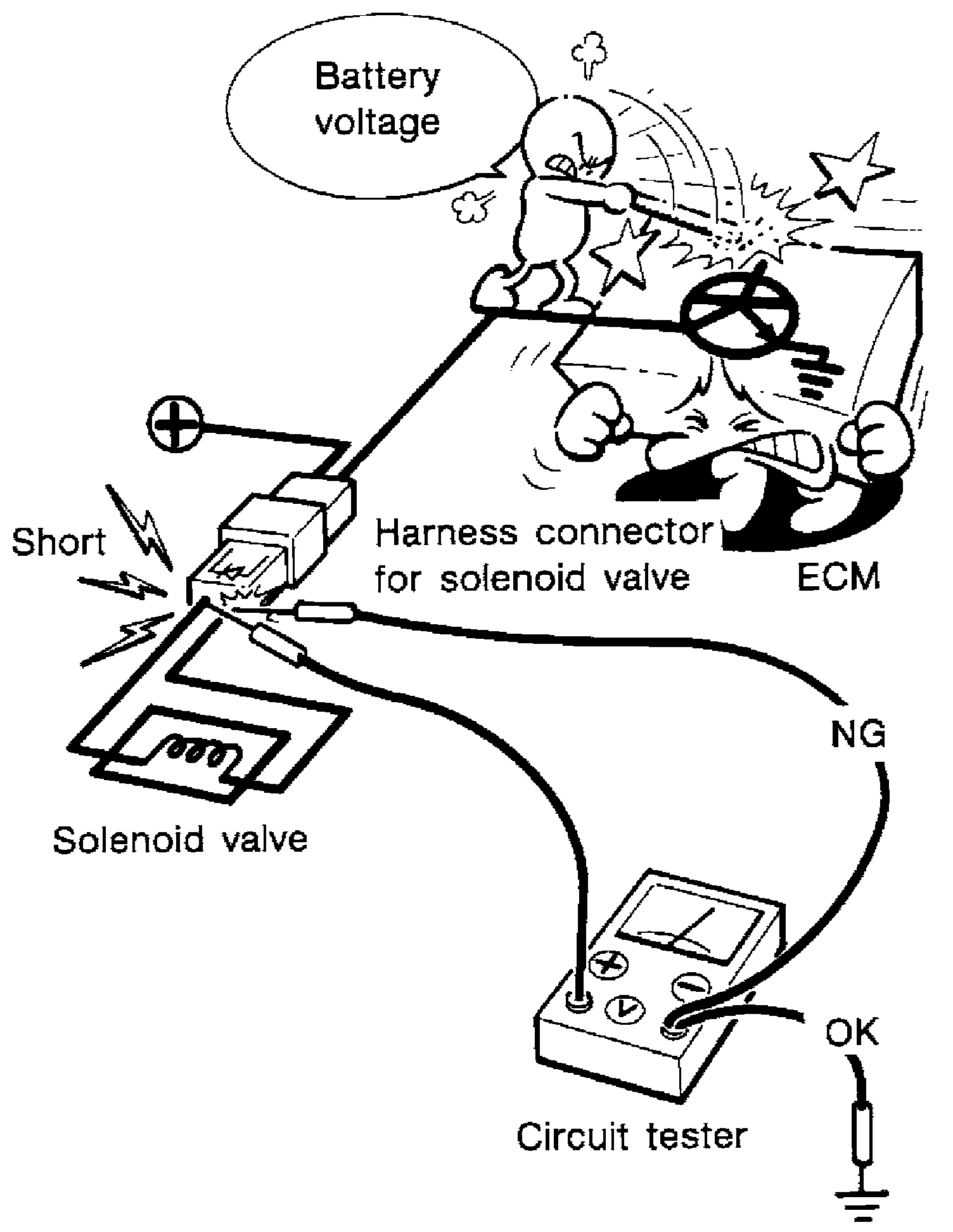 - When using a DMM, be careful not to let test probes get close to each other to prevent the power transistor in the control unit from damaging battery voltage because of short circuiting.