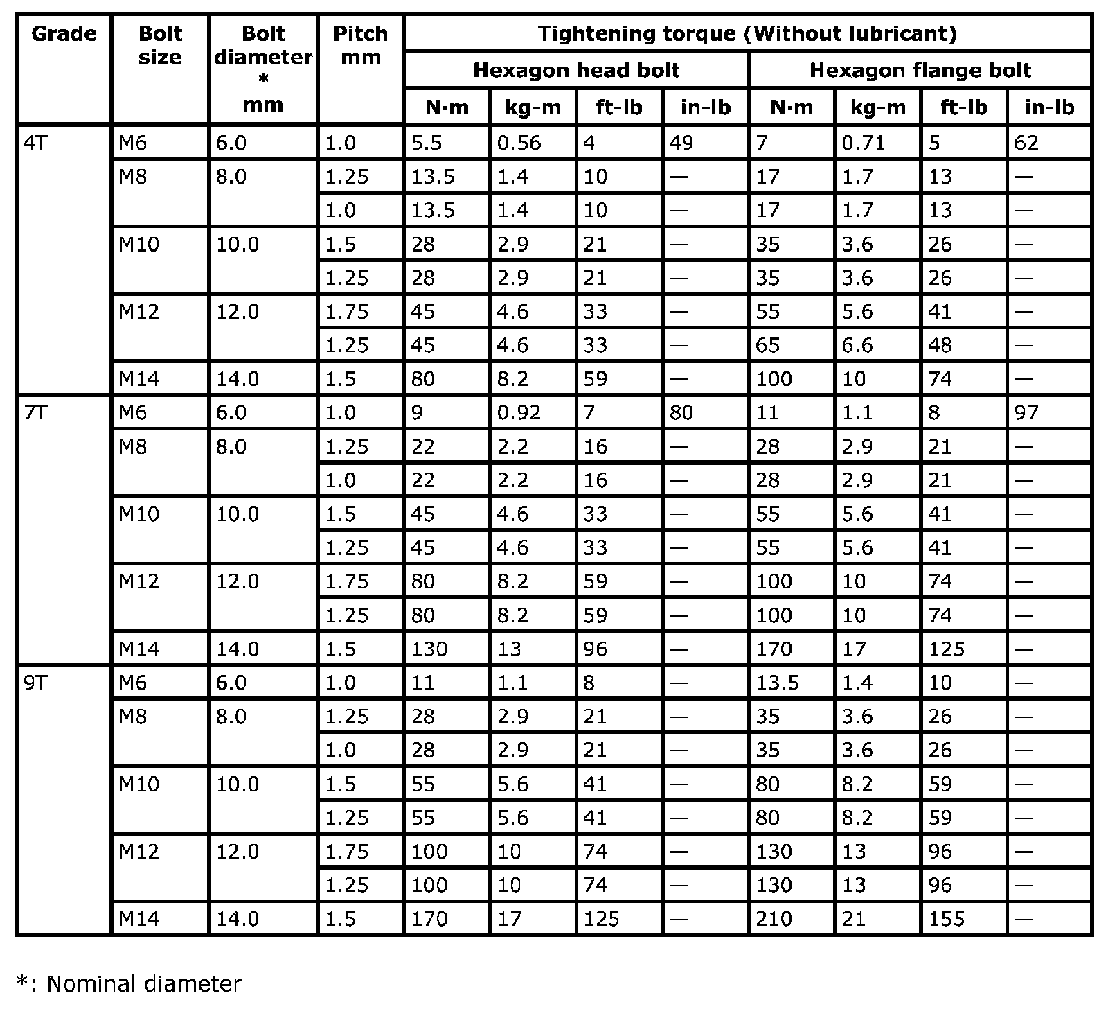 Tightening Torque of Standard Bolts: Tightening Torque Table