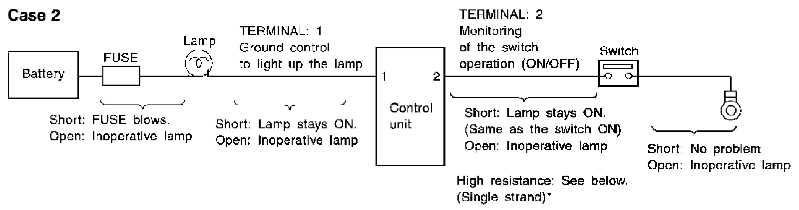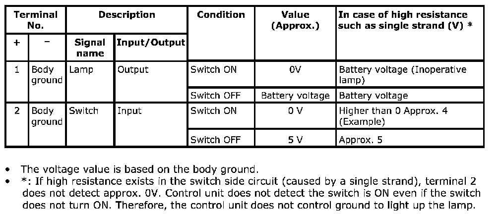 - *: If high resistance exists in the switch side circuit (caused by a single strand), terminal 2 does not detect approx. 0V. Control unit does not detect the switch is ON even if the switch does not turn ON. Therefore, the control unit does not control ground to light up the lamp.