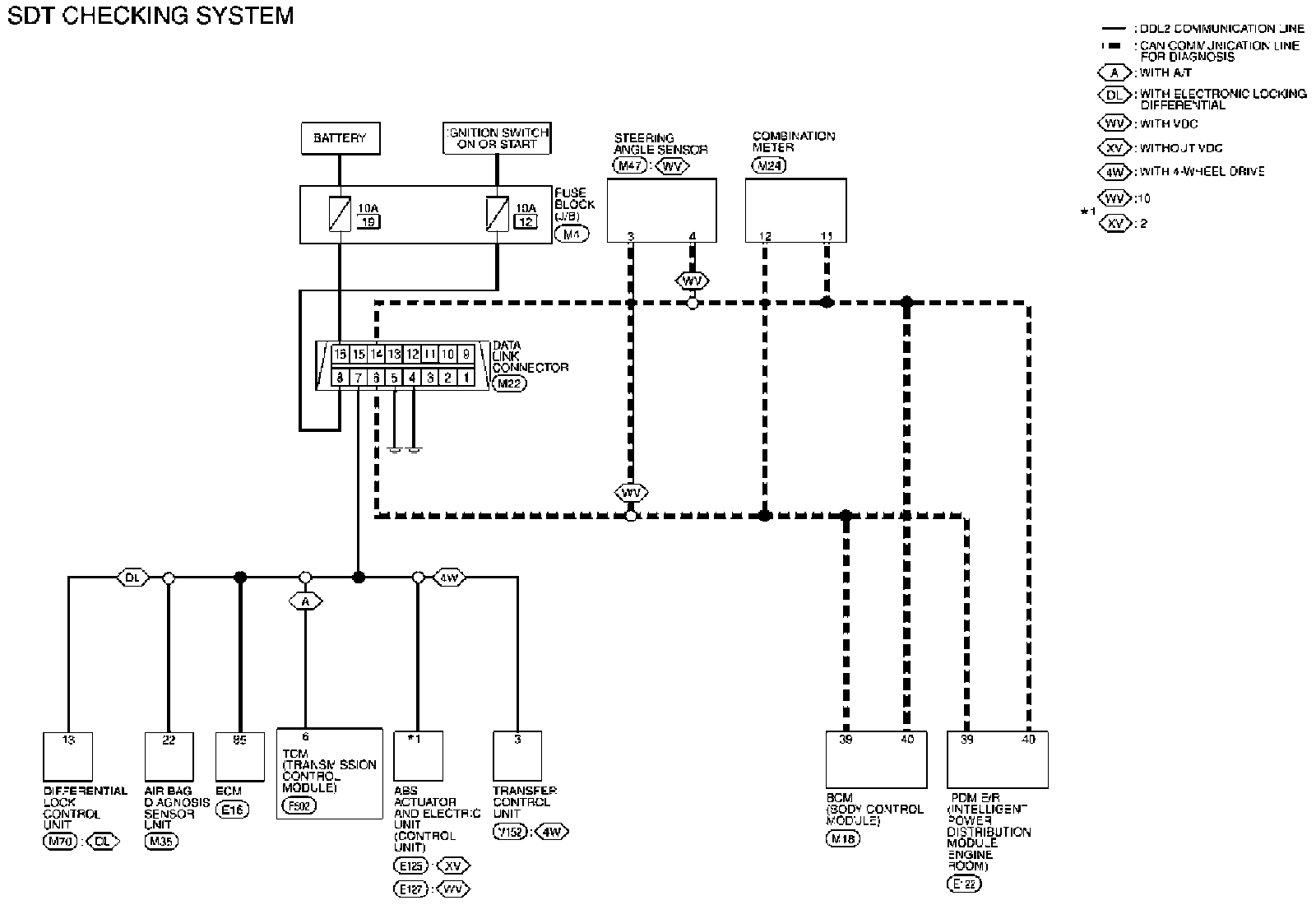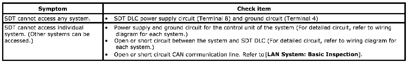 NOTE: The CAN and DDL2 circuits from DLC pins 6, 7 and 14 may be connected to more than one system. A short in any circuit connected to a control unit in one system may affect SDT access to other systems.