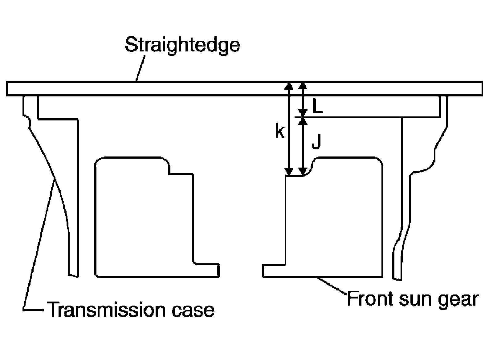 "J": Distance between oil pump fitting surface of transmission case and needle bearing mating surface of front sun gear.