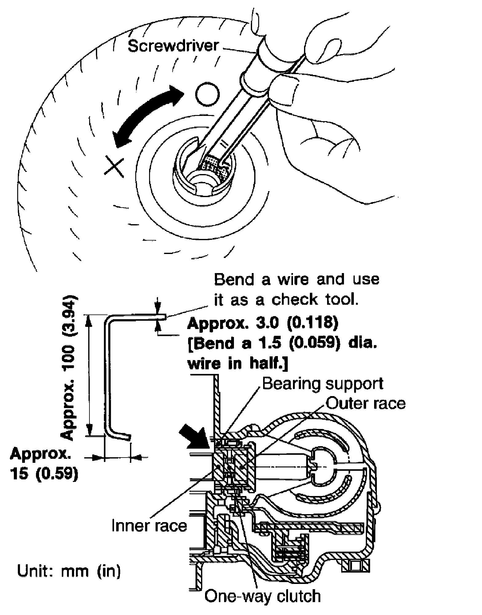 a) Insert a check tool into the groove of bearing support built into one-way clutch outer race.