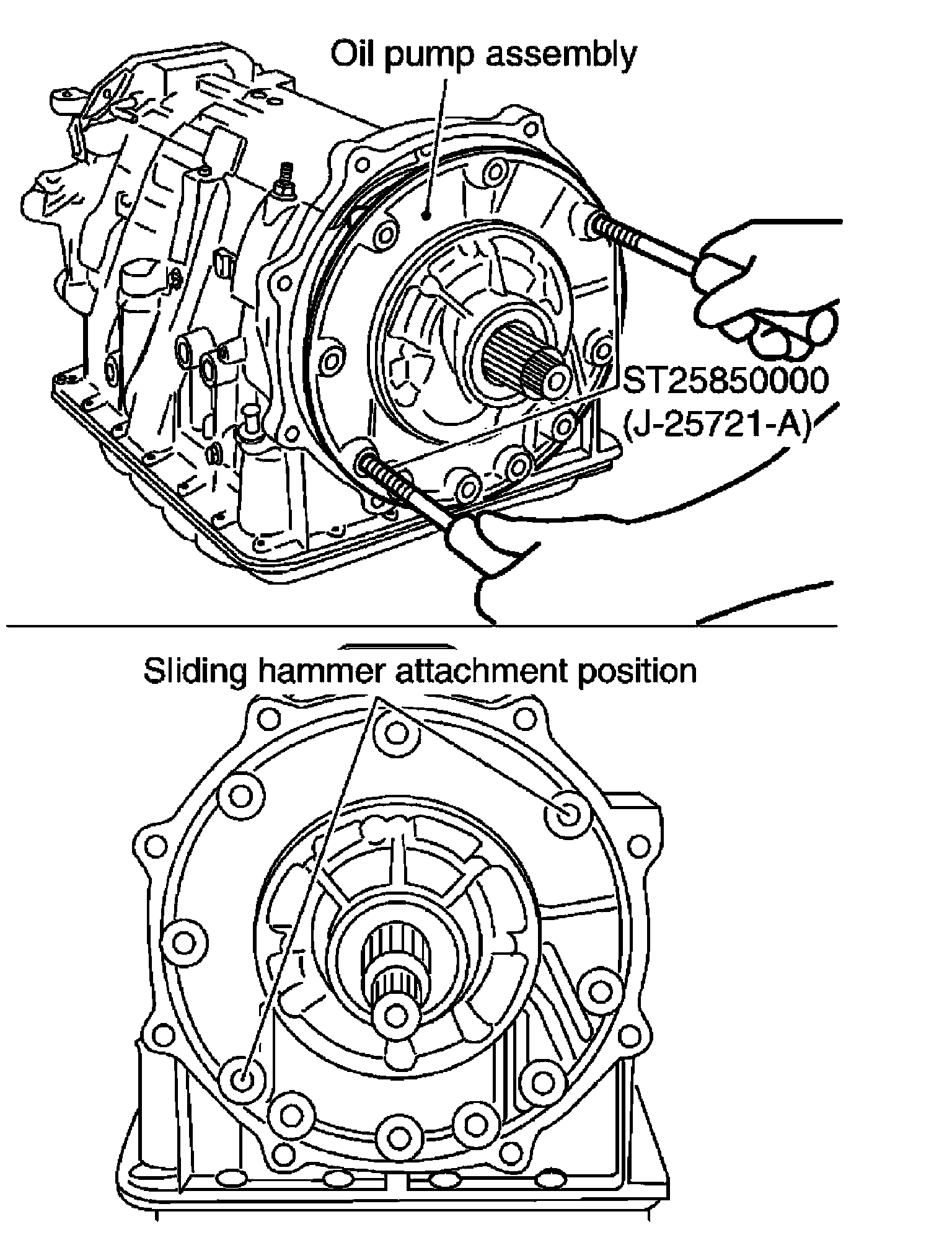 7) Remove the oil pump assembly evenly from the transmission case using Tools.