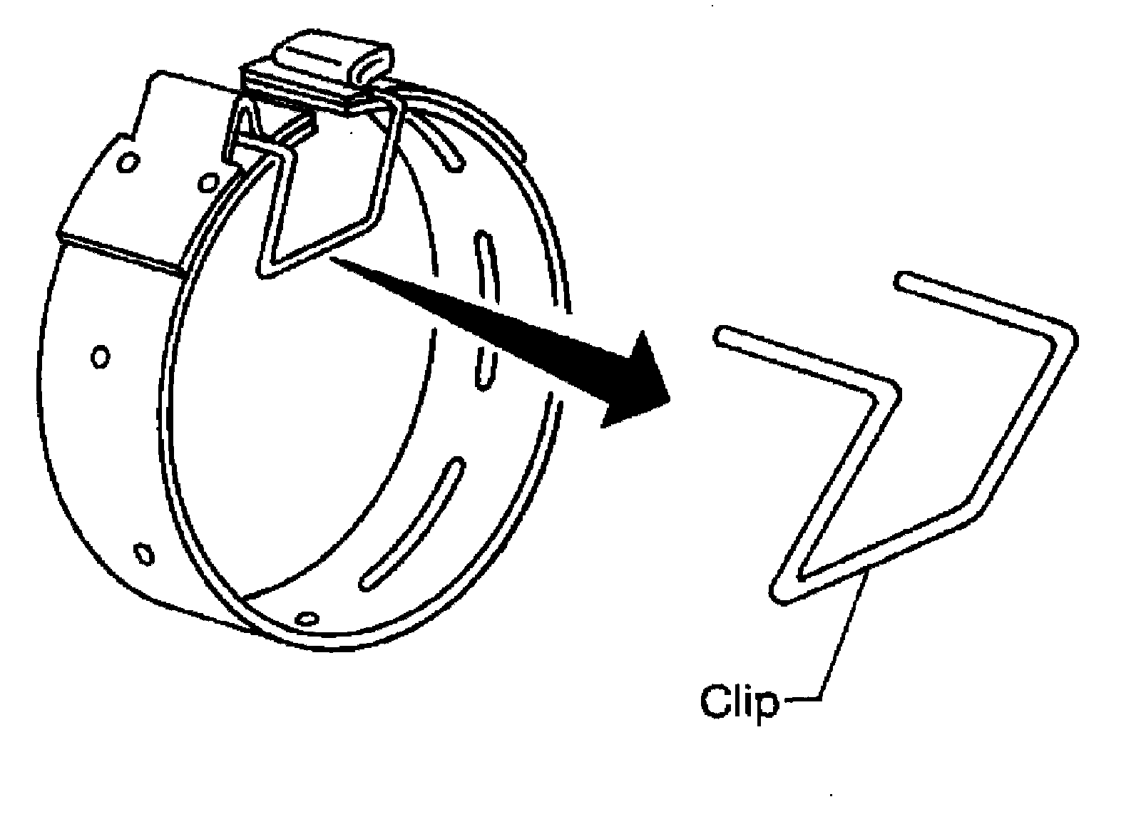 ^ To prevent brake linings from cracking or peeling, do not stretch the flexible band unnecessarily. When removing the brake band, always secure it with a clip as shown.