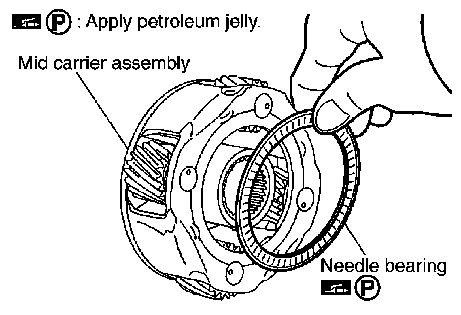 19) Remove needle bearing (rear side) from mid carrier assembly.
