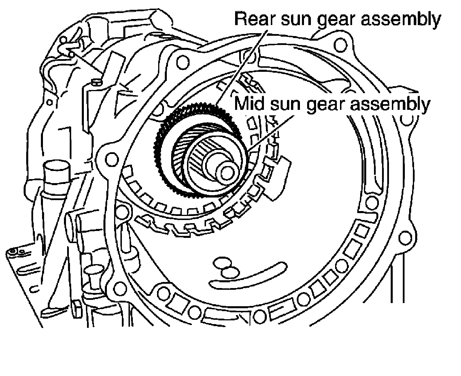 22) Remove mid sun gear assembly, rear sun gear assembly and high and low reverse clutch hub as a unit.