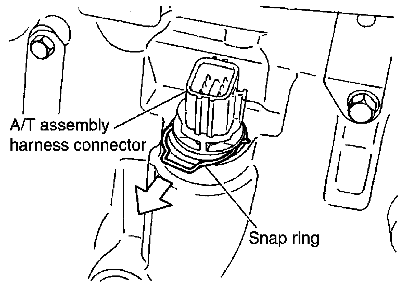 26) Remove snap ring from A/T assembly harness connector.