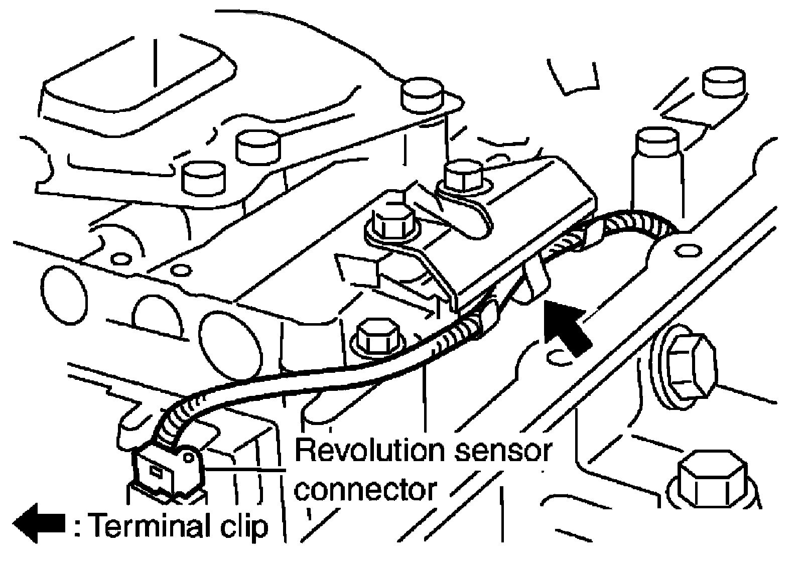 33) Straighten terminal clip to free revolution sensor harness.