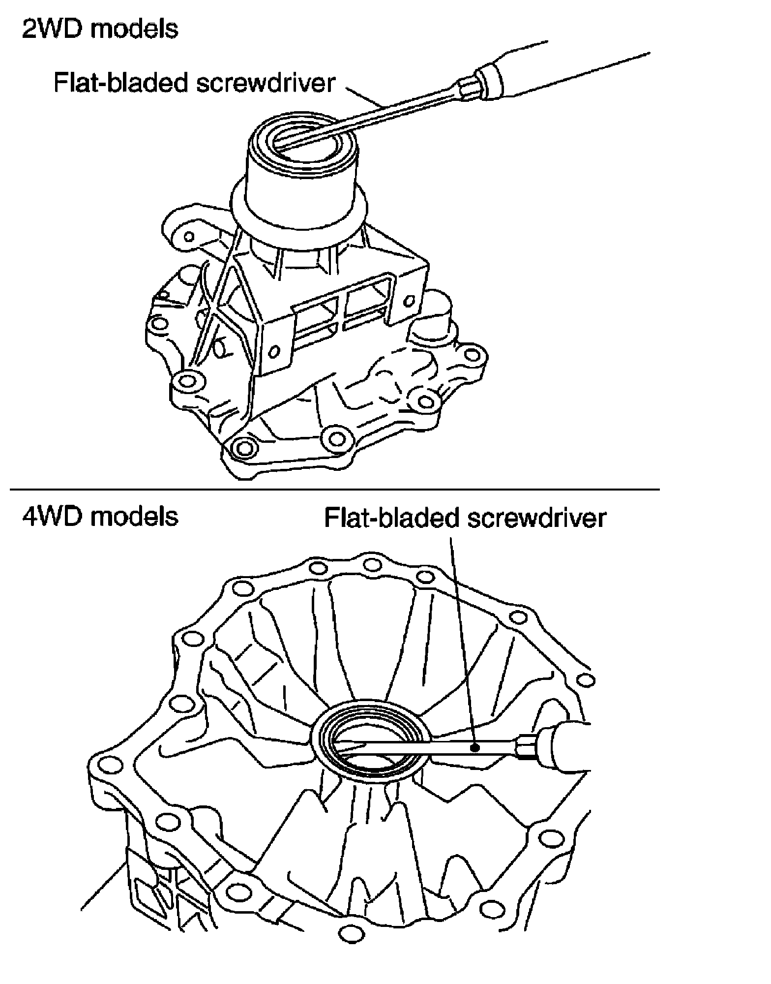 75) Remove rear oil seal from rear extension (2WD models) or adapter case (4WD models) using suitable tool.