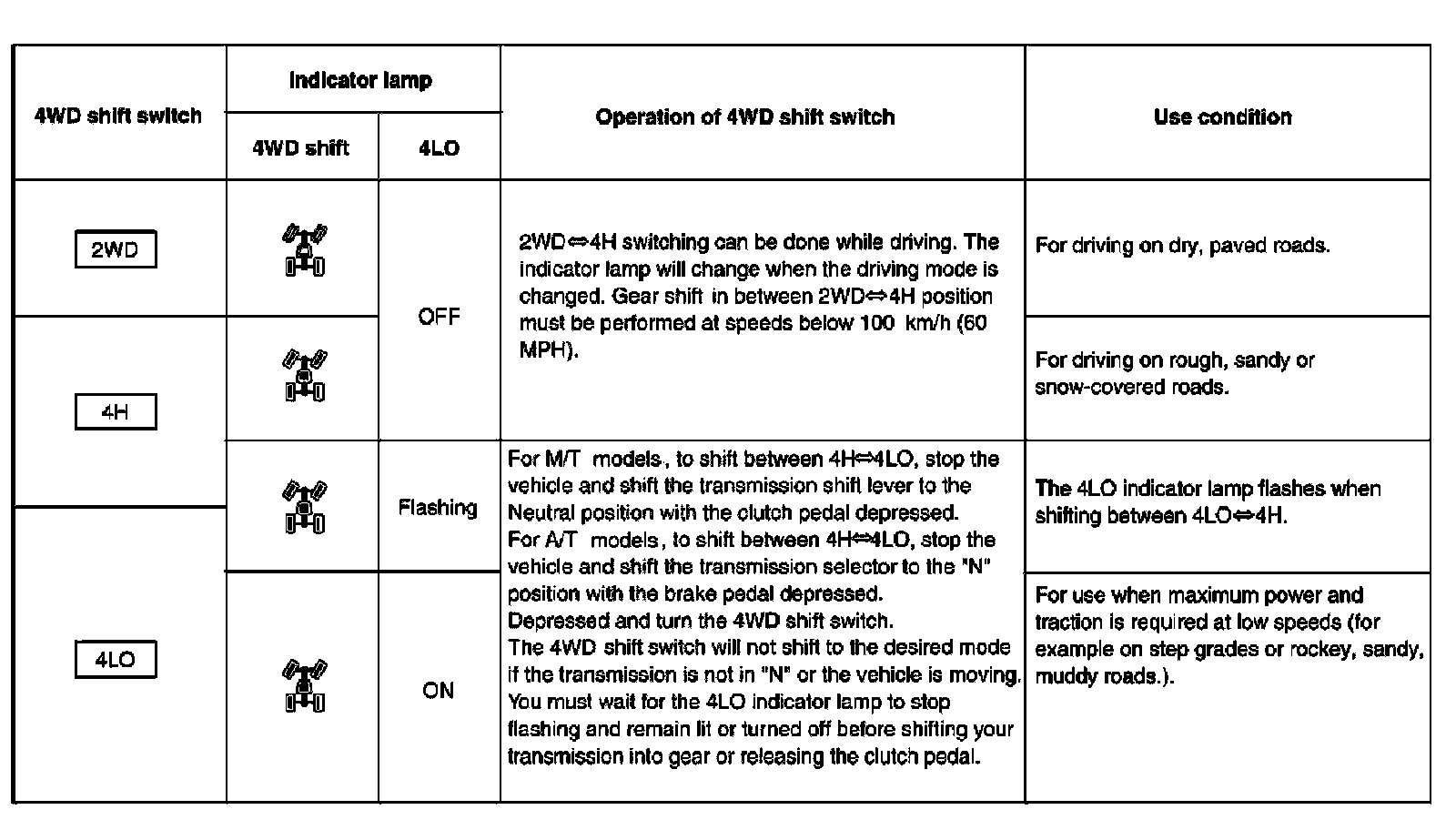 ^ Displays driving conditions selected by the 4WD shift switch while engine is running. When the 4WD warning lamp is turned on, all 4WD shift indicator lamps will turn off.