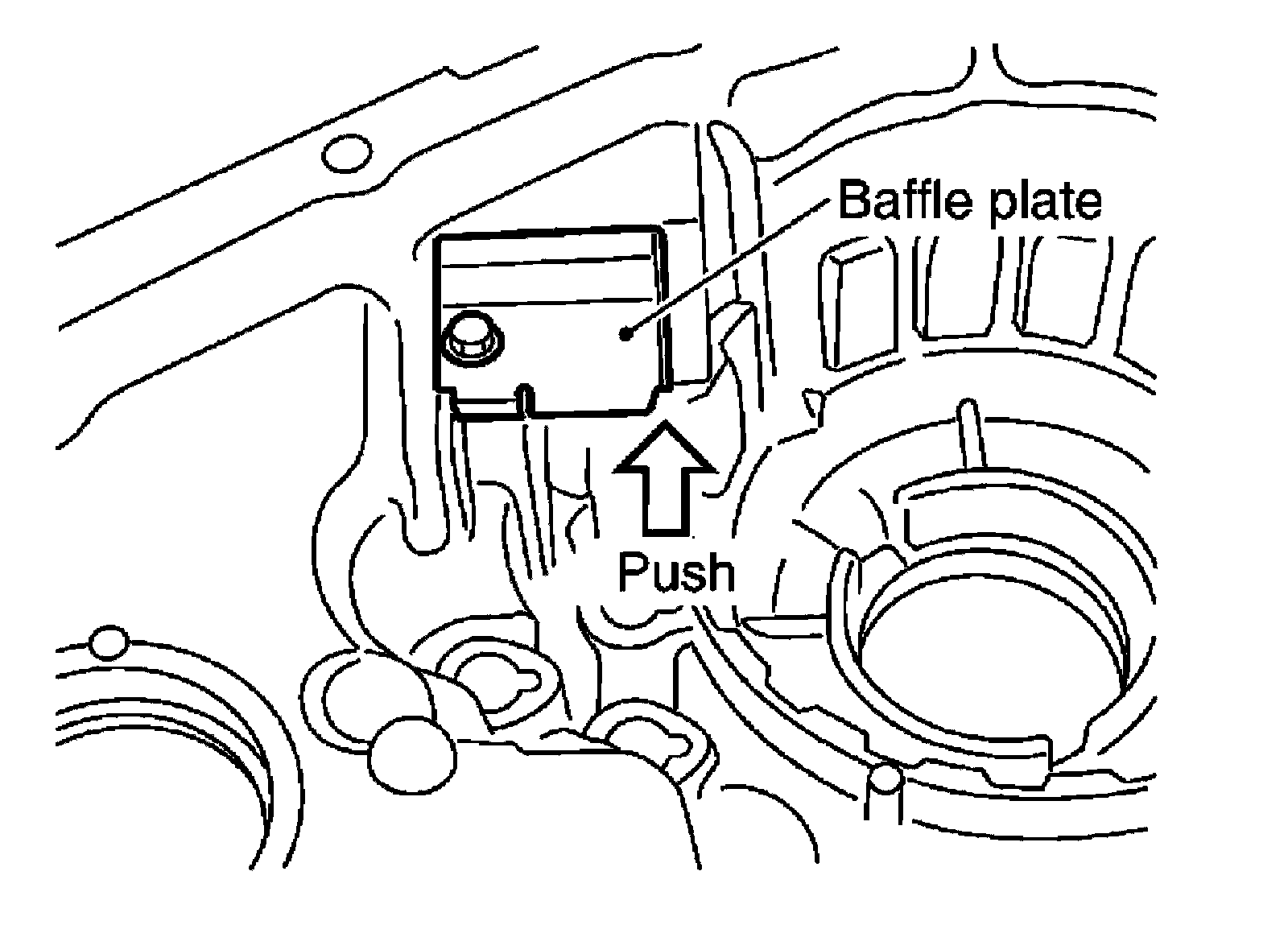 Install baffle plate by pushing it in the direction shown while tightening the bolt.
