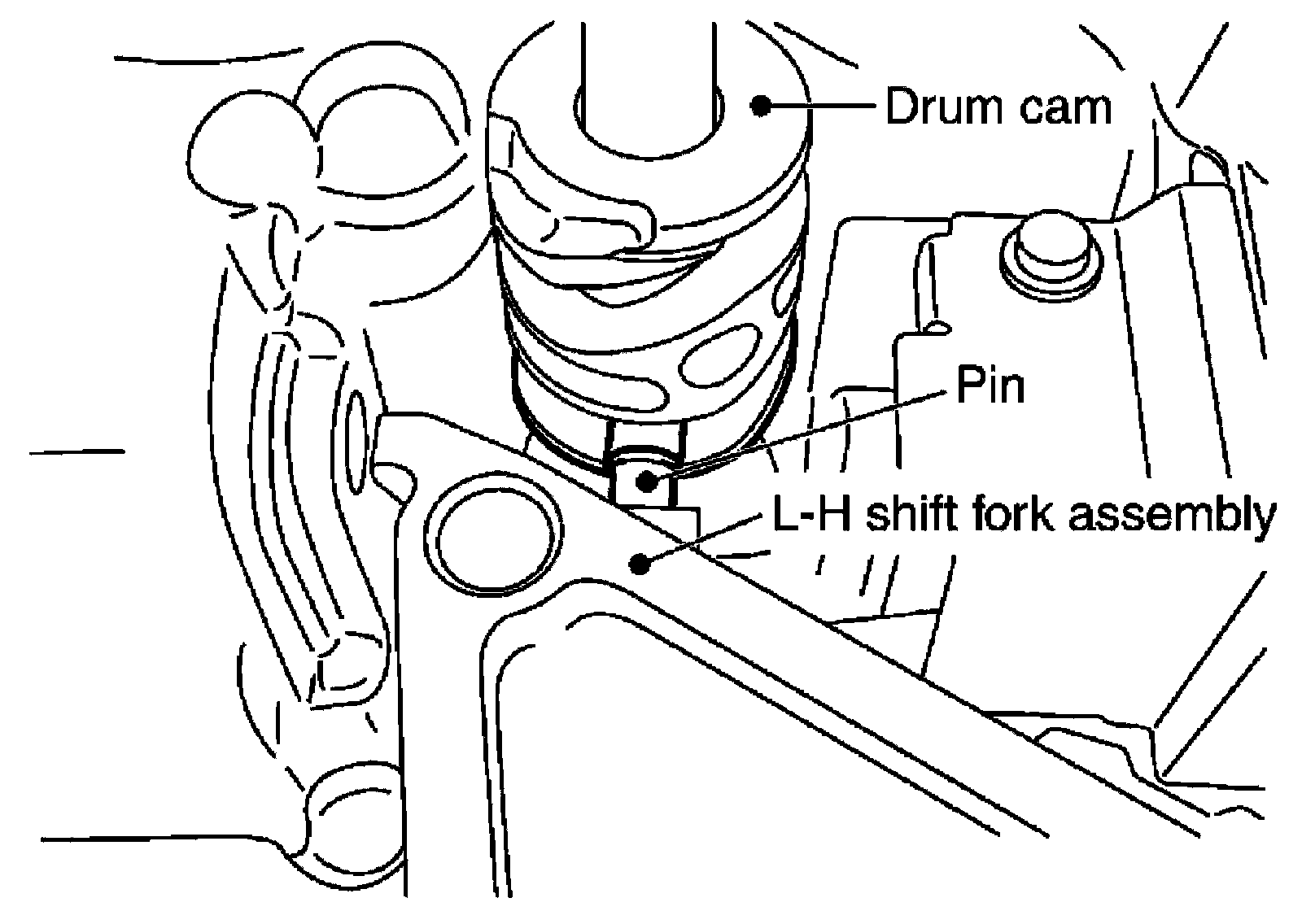 Set pin of L-H shift fork assembly into the groove of drum cam.