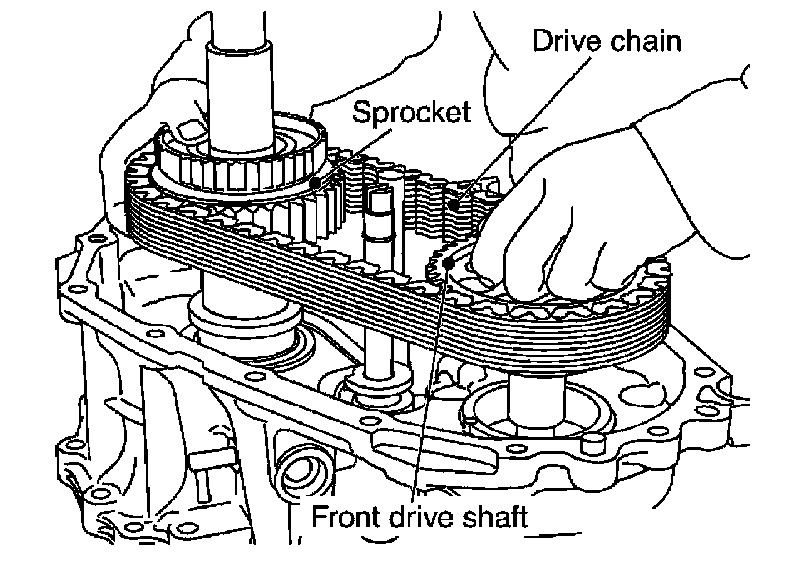 15) Install the drive chain together with the front drive shaft and sprocket to the front case.